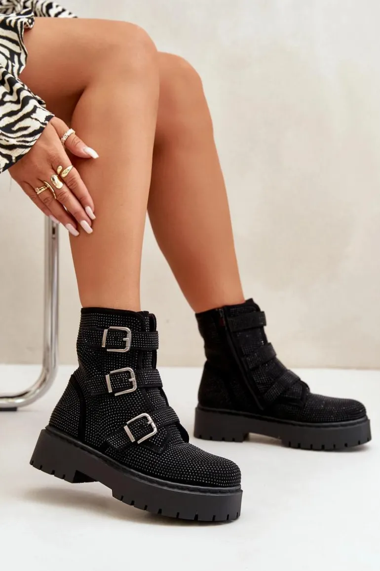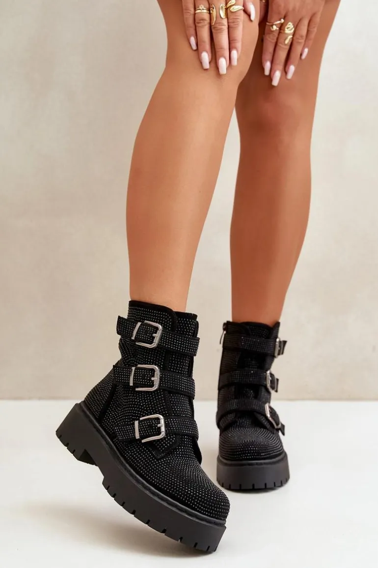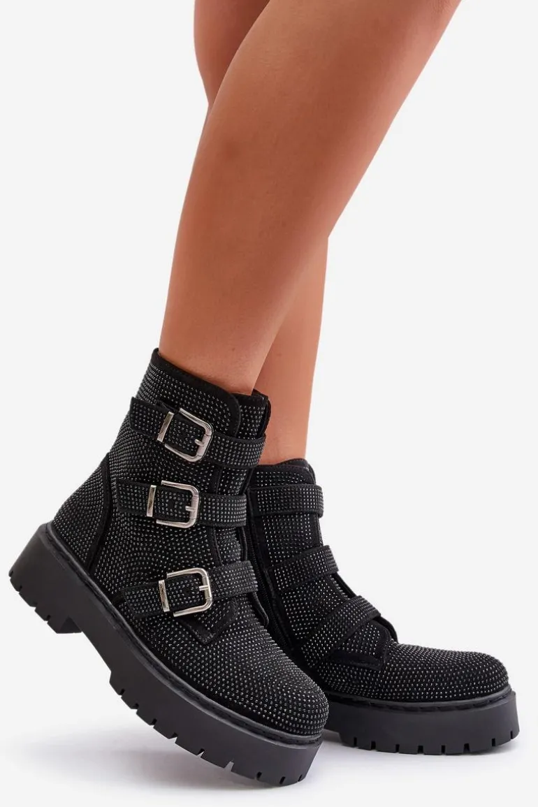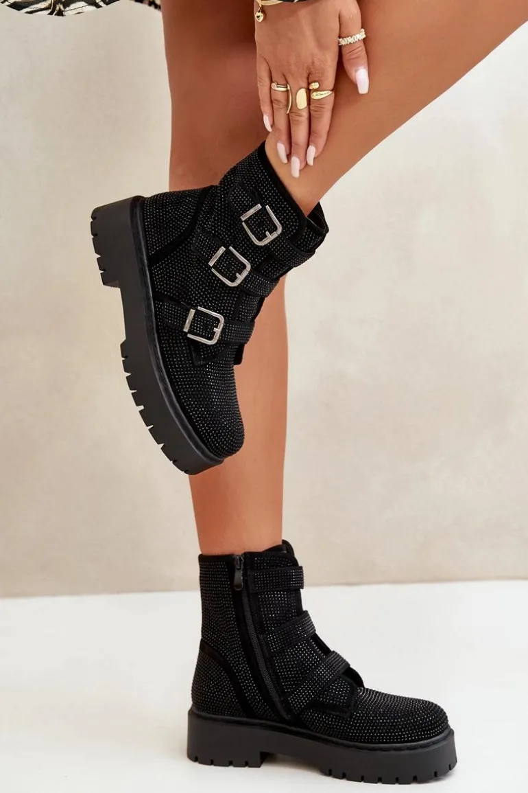 Stylowe damskie botki to niezbędny element jesienno-zimowej garderoby. Model ten wyróżnia się zdobioną cholewką oraz regulowanym paskami z klamrami. Zapinane na zamek, co ułatwi zakładanie i zdejmowanie obuwia. Środek ocieplony kocem obuwniczym. Doskonale sprawdzą się w różnych stylizacjach! Przy wyborze rozmiaru prosimy sugerować się tabelą rozmiarów.