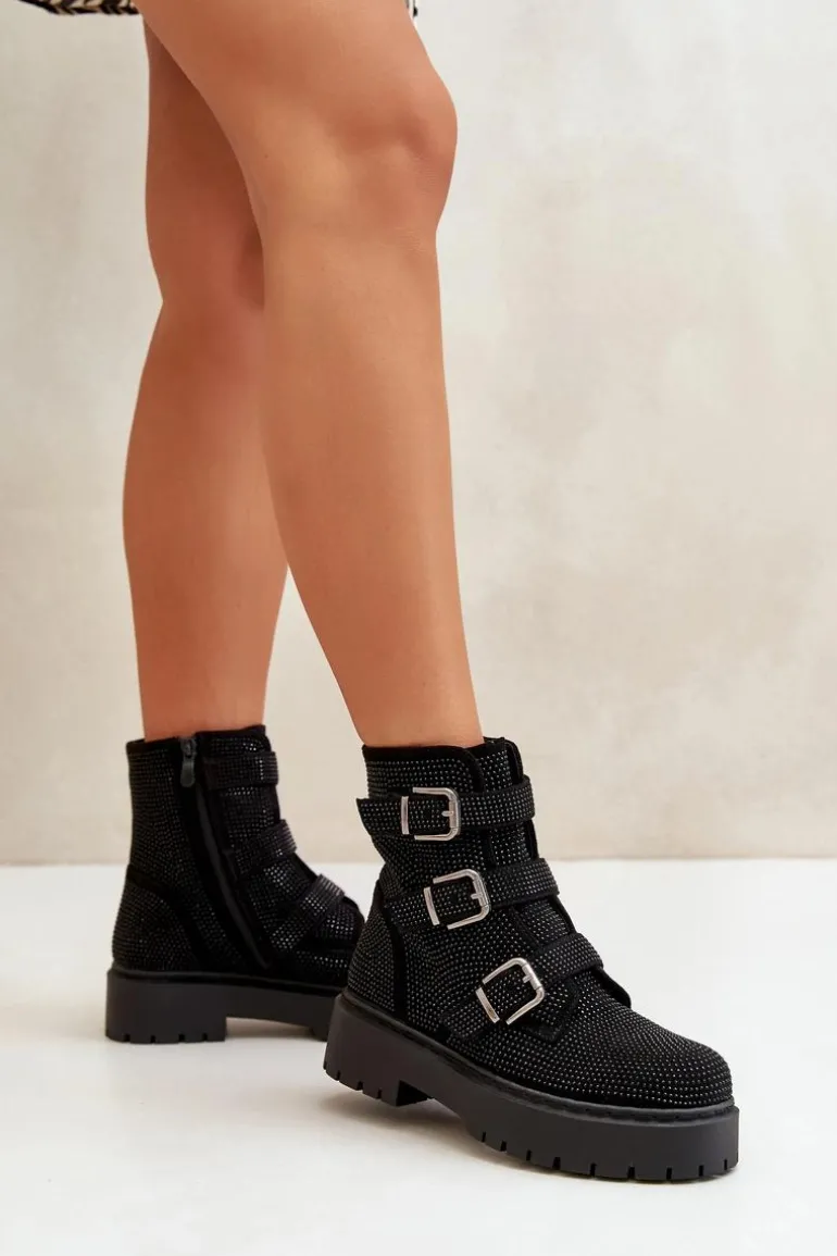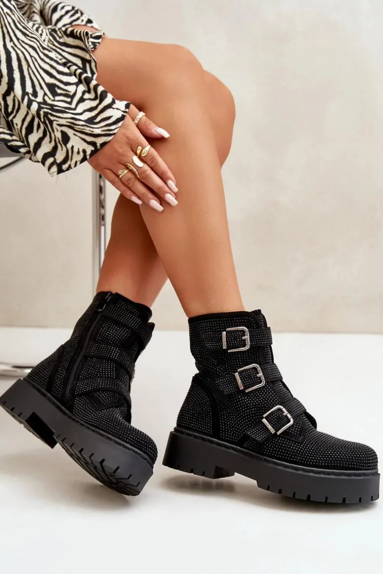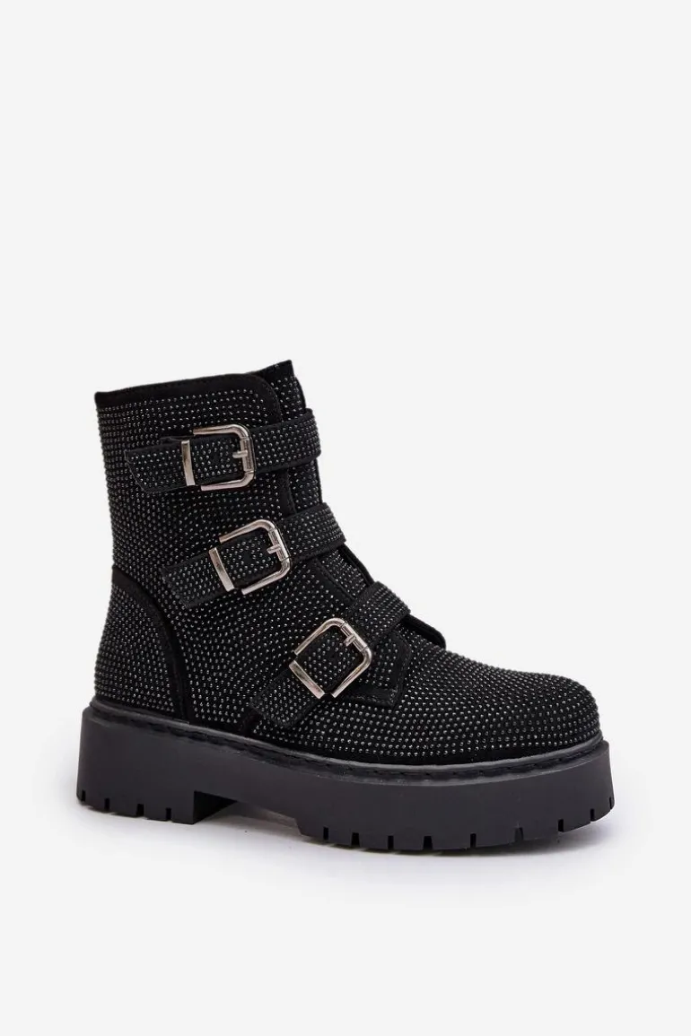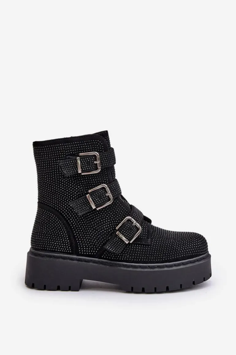 Stylowe damskie botki to niezbędny element jesienno-zimowej garderoby. Model ten wyróżnia się zdobioną cholewką oraz regulowanym paskami z klamrami. Zapinane na zamek, co ułatwi zakładanie i zdejmowanie obuwia. Środek ocieplony kocem obuwniczym. Doskonale sprawdzą się w różnych stylizacjach! Przy wyborze rozmiaru prosimy sugerować się tabelą rozmiarów.