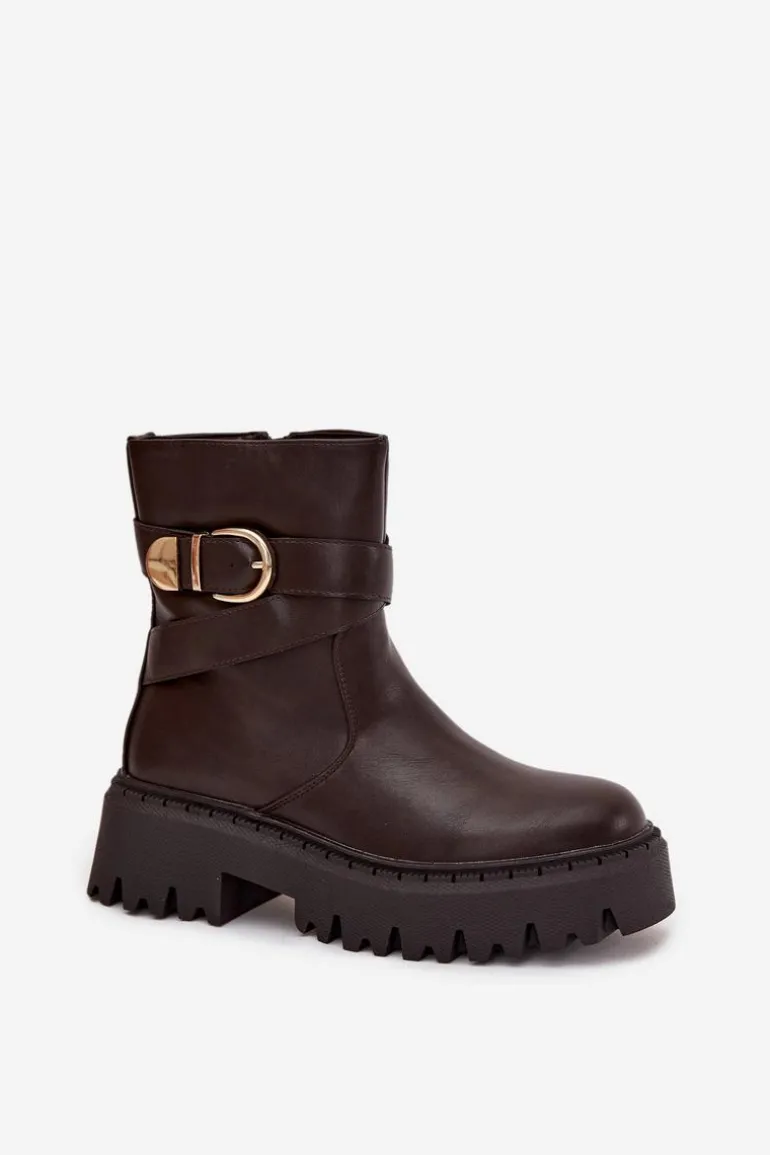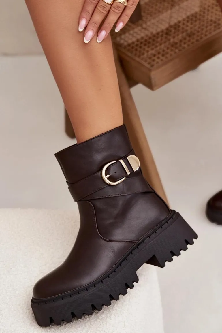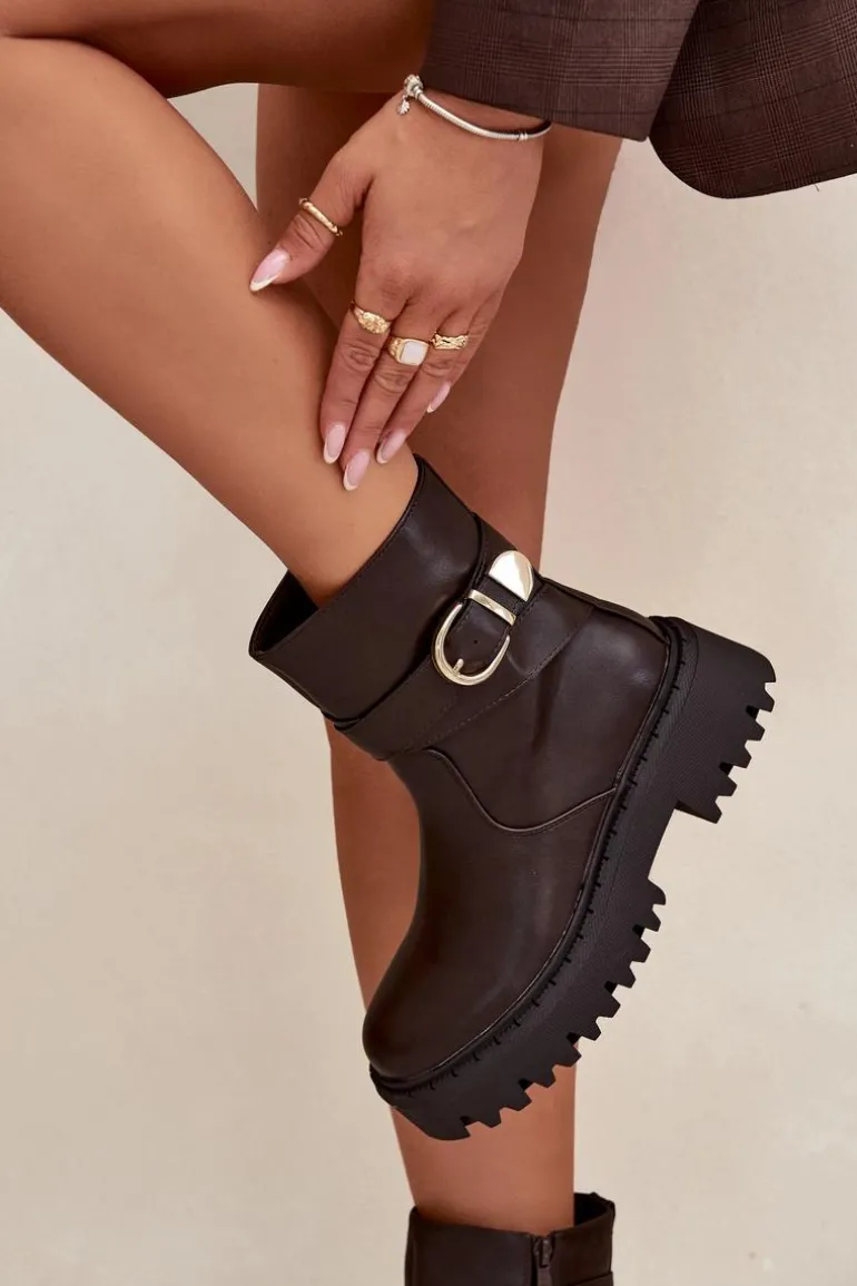 Damskie botki wykonane z eko skóry. Osadzone na platformie z płaskim obcasem zapewniają wygodę i stabilność podczas chodzenia. Wnętrze ocieplane miękkim kocem obuwniczym gwarantuje komfort oraz ciepło, nawet w zimniejsze dni. Botki zapinane są na praktyczny zamek, dzięki czemu łatwo się je zakłada i zdejmuje. Dodatkowym akcentem jest stylowy pasek z klamrą na cholewce, który nadaje całości modnego, nieco rockowego charakteru. Świetnie sprawdzą się w casualowych stylizacjach z jeansami, jak i w zestawieniach z sukienką czy spódnicą. Przy wyborze rozmiaru prosimy sugerować się tabelą rozmiarów.