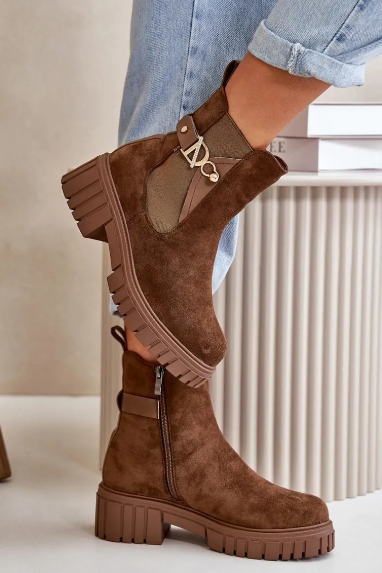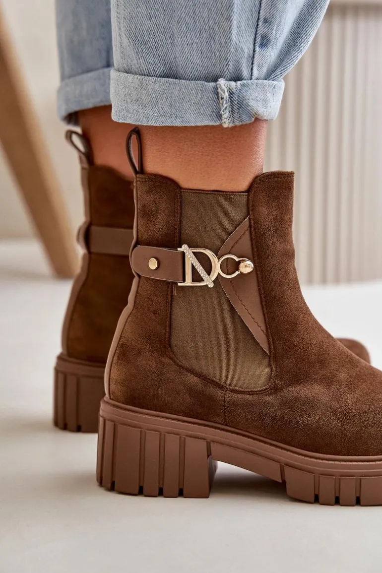 Botki damskie wykonane z miękkiego eko zamszu. Wnętrze ocieplone kocem obuwniczym sprawia, że są one doskonałym rozwiązaniem na chłodne dni. Wyróżniającym się elementem tego modelu jest złoty detal, który dodaje im wyjątkowego uroku i elegancji. Zapinanie na zamek ułatwia zakładanie i zdejmowanie obuwia. Doskonale sprawdzą się w połączeniu z różnymi elementami garderoby, od jeansów po eleganckie sukienki, podkreślając unikalny styl każdej kobiety. Przy wyborze rozmiaru prosimy sugerować się tabelą rozmiarów.