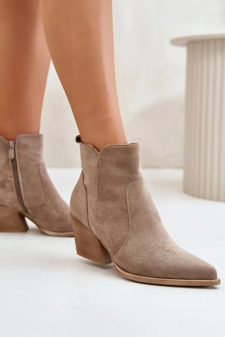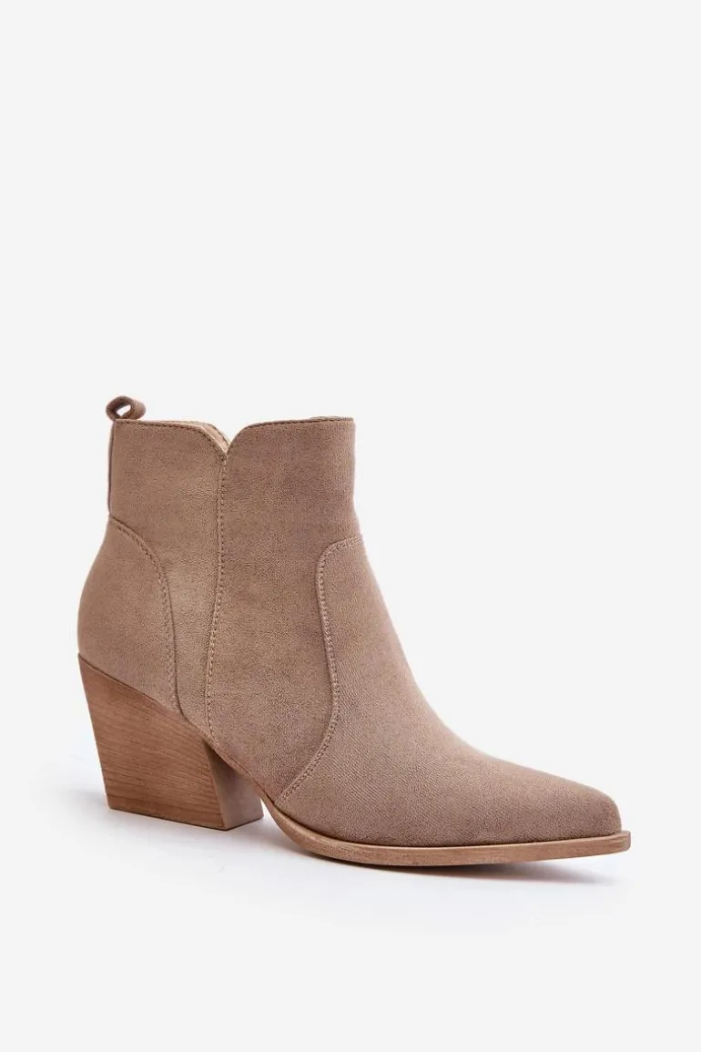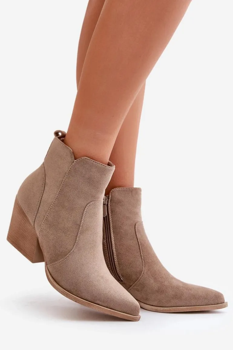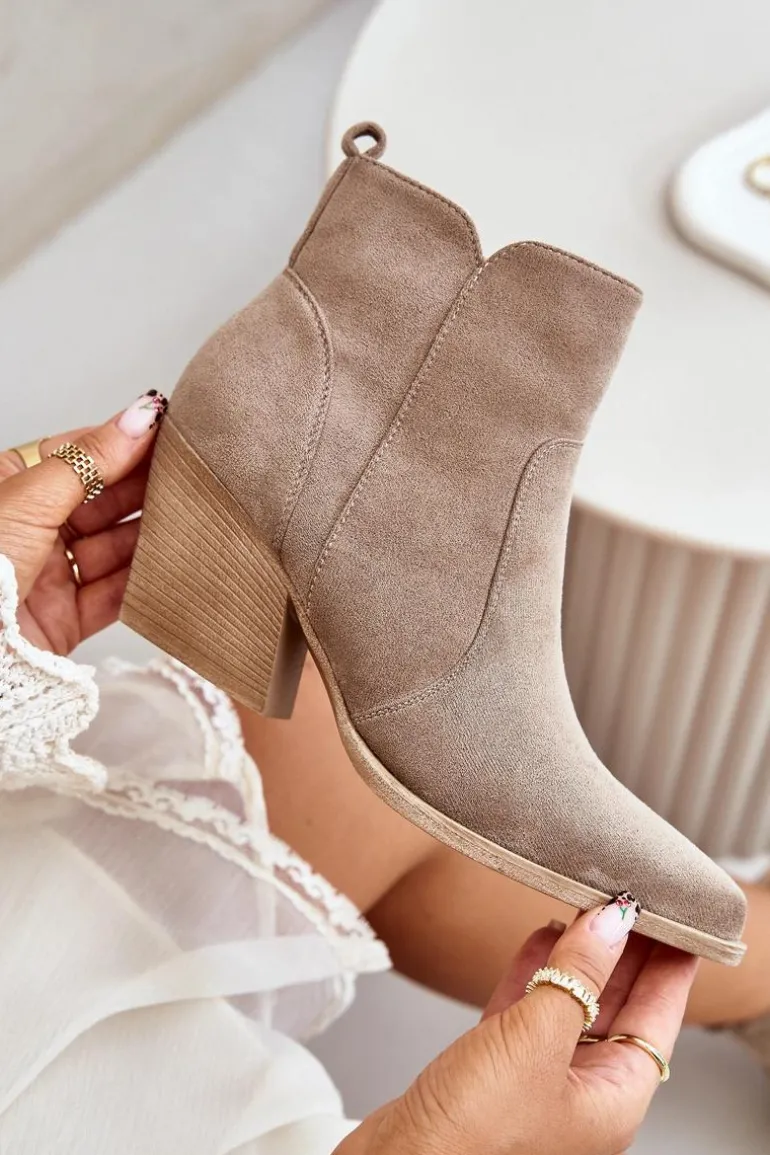 Botki w stylu kowbojek, wykonane z eko zamszu, to idealny wybór na chłodniejsze dni. Osadzone na stabilnym obcasie typu słupek, zapewniają komfort noszenia i elegancję. Szpiczaste noski optycznie wysmuklają nogi, dodając sylwetce lekkości. Wnętrze ocieplone kocem obuwniczym gwarantuje ciepło, a suwak ułatwia zakładanie i zdejmowanie butów. Idealne do jesiennych stylizacji. Przy wyborze rozmiaru prosimy sugerować się tabelą rozmiarów.