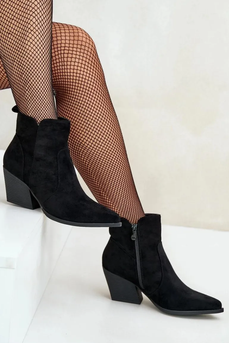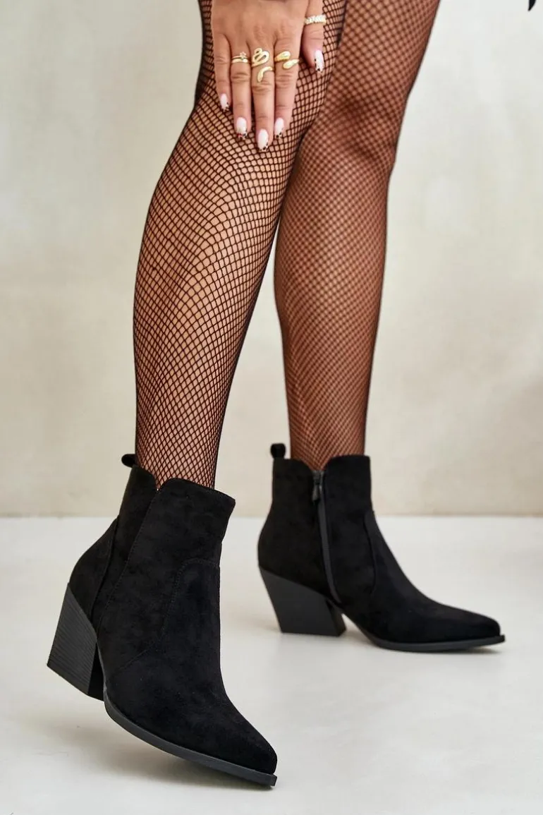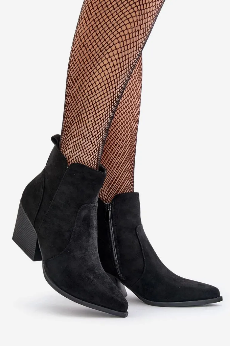 Botki w stylu kowbojek, wykonane z eko zamszu, to idealny wybór na chłodniejsze dni. Osadzone na stabilnym obcasie typu słupek, zapewniają komfort noszenia i elegancję. Szpiczaste noski optycznie wysmuklają nogi, dodając sylwetce lekkości. Wnętrze ocieplone kocem obuwniczym gwarantuje ciepło, a suwak ułatwia zakładanie i zdejmowanie butów. Idealne do jesiennych stylizacji. Przy wyborze rozmiaru prosimy sugerować się tabelą rozmiarów.