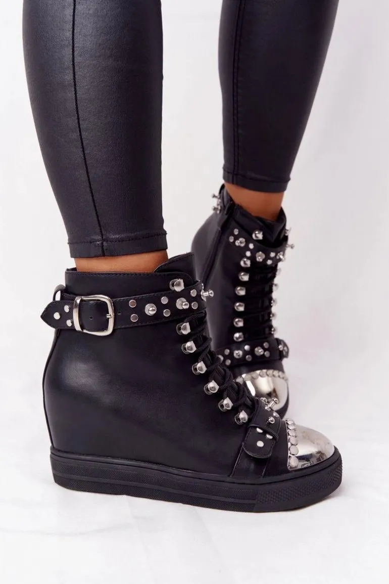 Wyjątkowe botki na koturnie z dżetami i klamrami. Buty wykonane są z eko skóry, posiadają ocieplenie w postaci koca obuwniczego. Botki świetnie wpiszą się w stylizacje glam rock lub grunge. Koniecznie sprawdź całą naszą kolekcje damskich botków! Przy wyborze rozmiaru prosimy sugerować się tabelą rozmiarów.