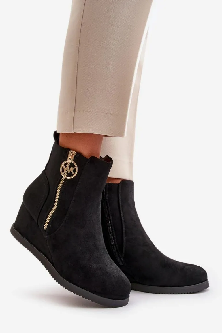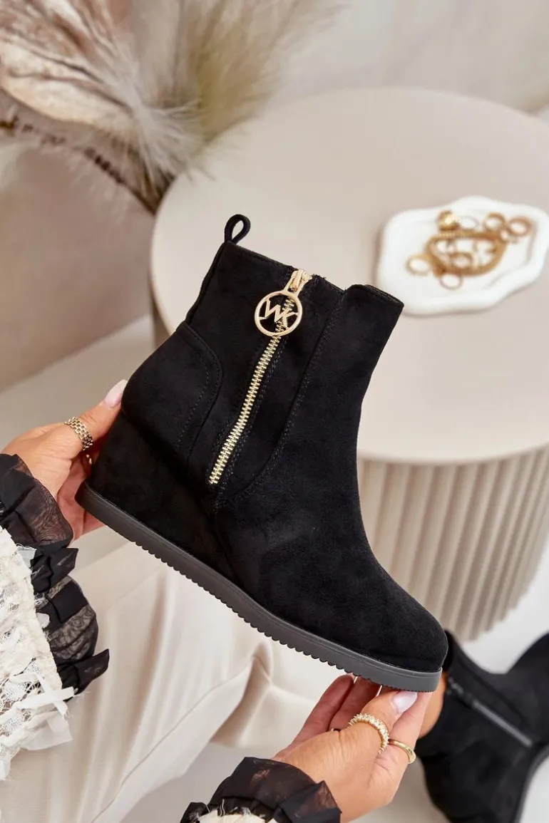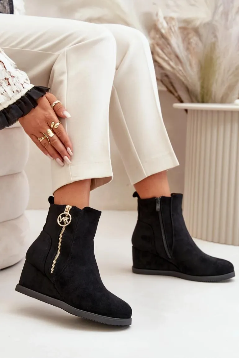 Botki damskie wykonane z eko zamszu, prezentują się elegancko i nowocześnie, idealnie wpisując się w różnorodne stylizacje. Zamek umieszczony po wewnętrznej stronie ułatwia szybkie i wygodne zakładanie oraz zdejmowanie. Osadzone na stabilnym koturnie, zapewniają komfort podczas chodzenia, a także subtelnie dodają centymetrów do wzrostu. Zapiętek został usztywniony dla dodatkowego wsparcia, a zaokrąglone noski dodają butom klasycznego uroku. Wnętrze butów jest ocieplone kocem obuwniczym, co gwarantuje ciepło i komfort nawet w najchłodniejsze dni. Przy wyborze rozmiaru prosimy sugerować się tabelą rozmiarów.