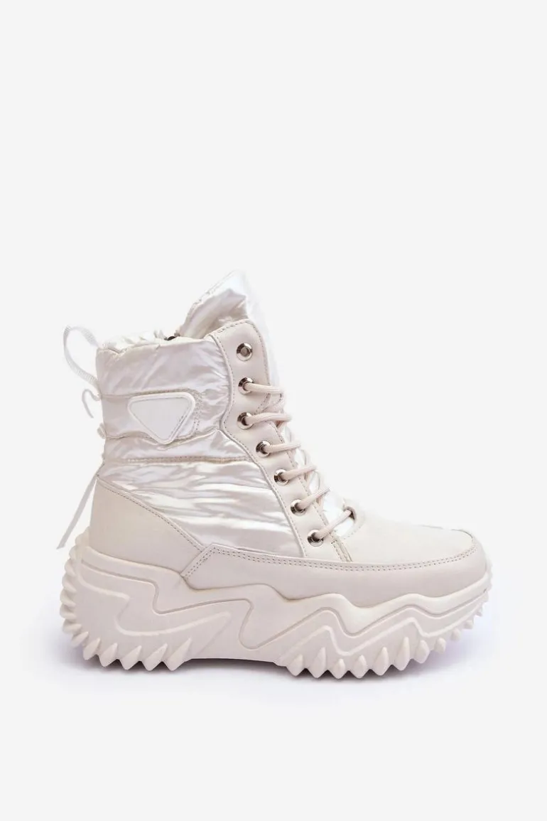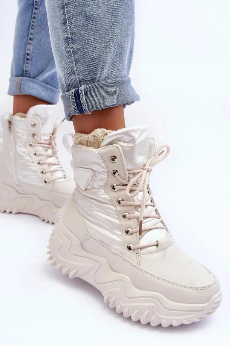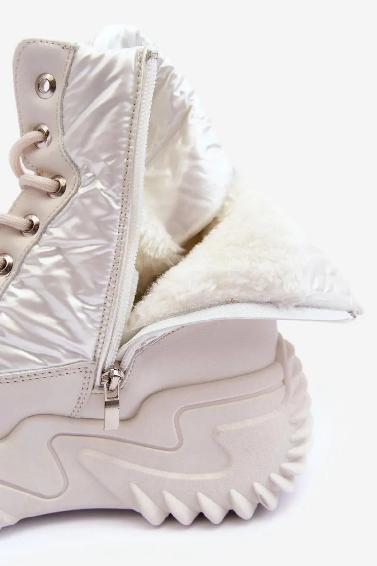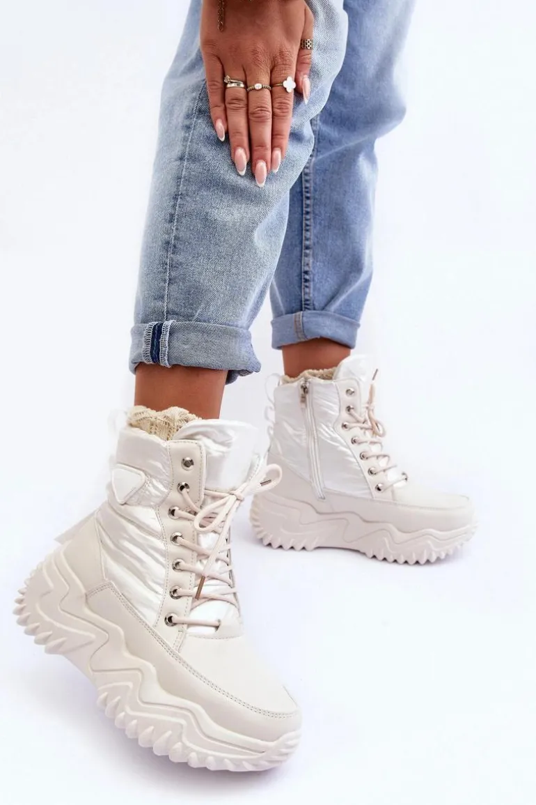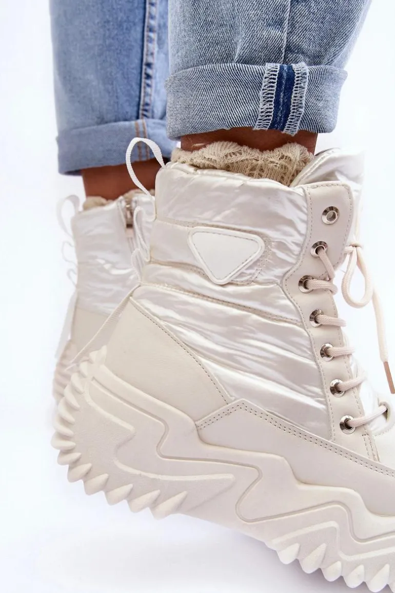 Botki damskie w sportowym stylu. Osadzone na masywnej platformie. Wewnątrz znajduje się ciepłe i miłe w dotyku futerko. Zapinane na suwak po wewnętrznej stronie cholewki oraz dodatkowo sznurowane. Buty idealnie sprawdzą się w zimowe dni! Przy wyborze rozmiaru prosimy sugerować się tabelą rozmiarów.