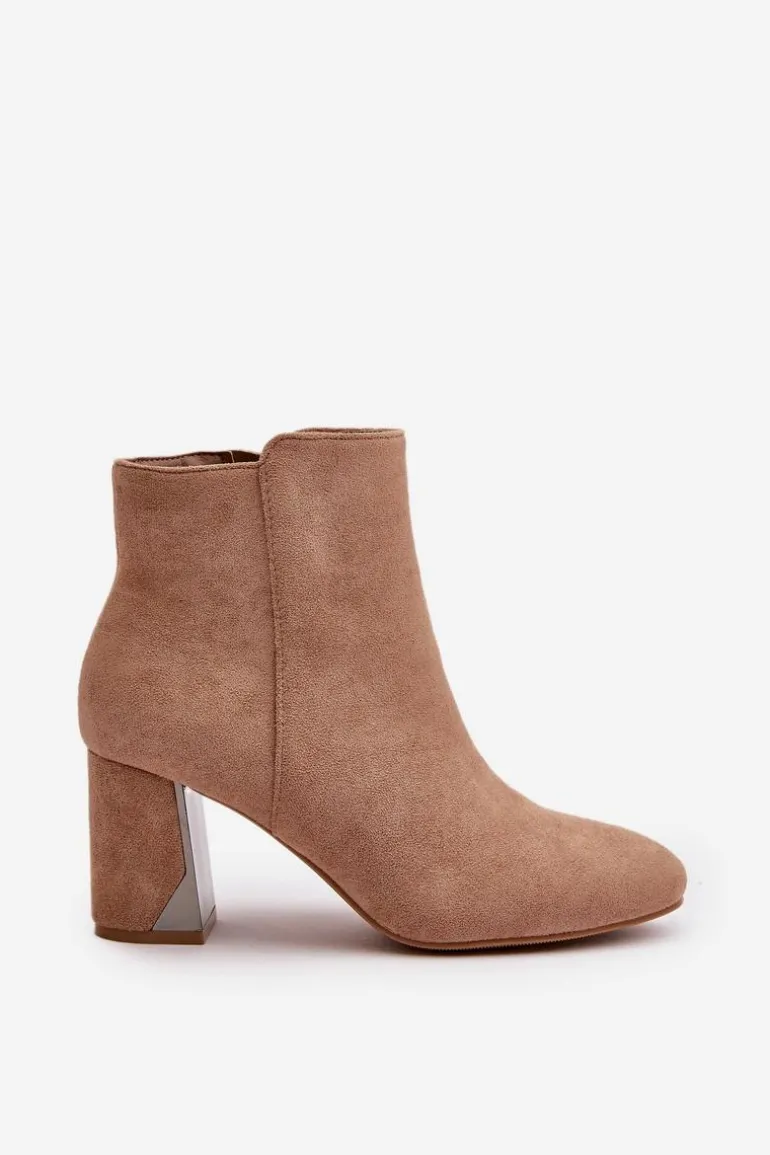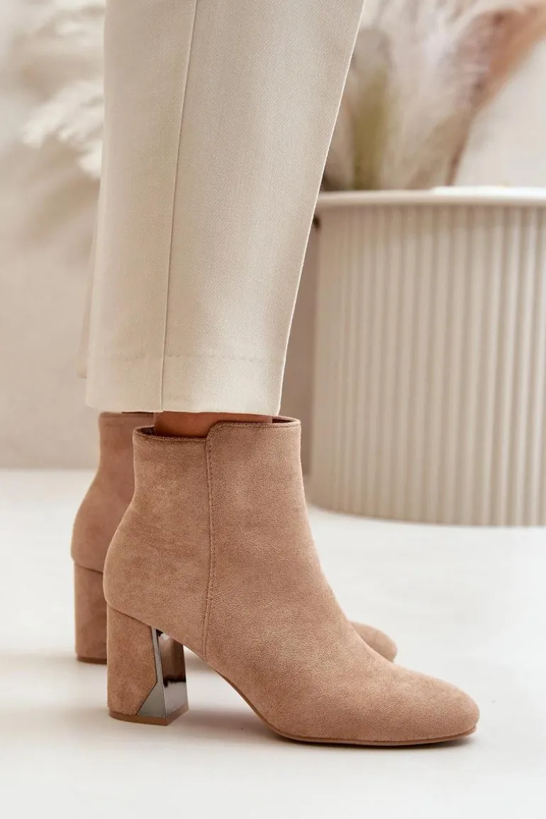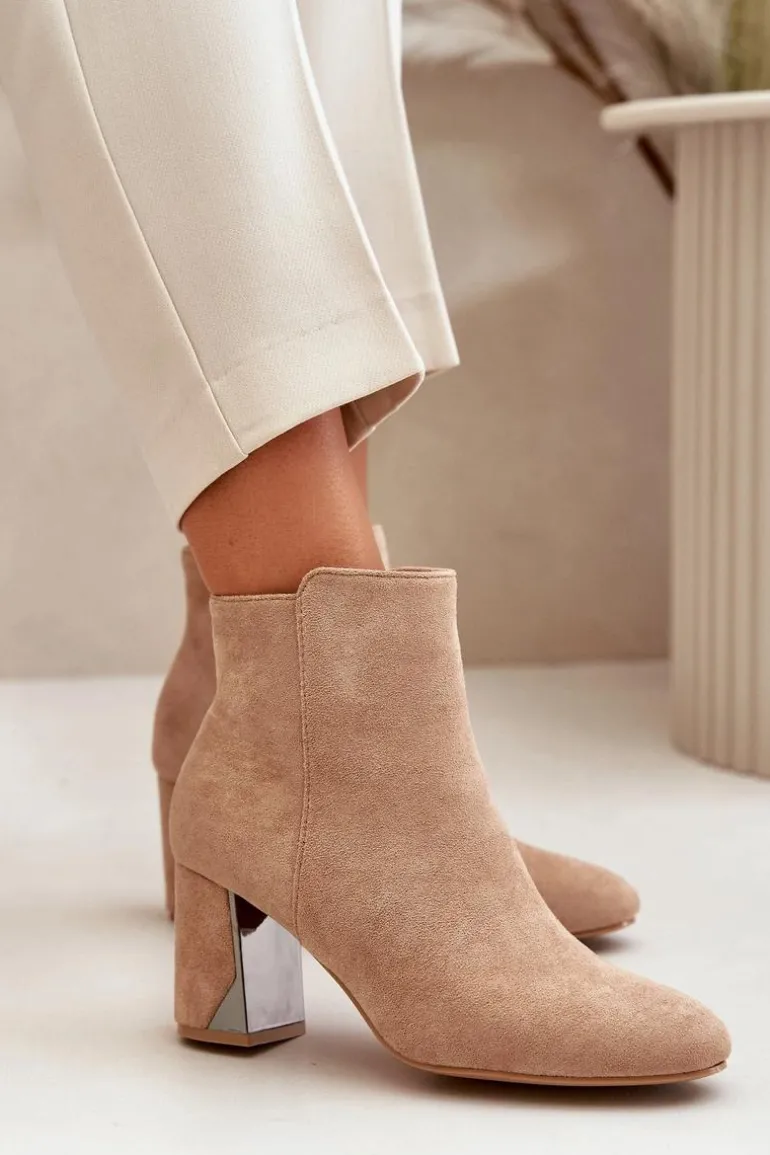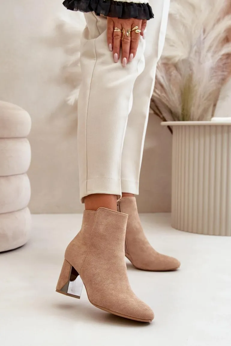 Botki damskie wykonane z eko zamszu. Osadzone na obcasie typu słupek wraz z lustrzanym elementem. Wnętrze ocieplone jest kocem obuwniczym, co zapewni ciepło w chłodniejsze dni. Zapinane na zamek. Noski zaokrąglone. Usztywniony zapiętek zwiększy stabilizację stopy. Przy wyborze rozmiaru prosimy sugerować się tabelą rozmiarów.