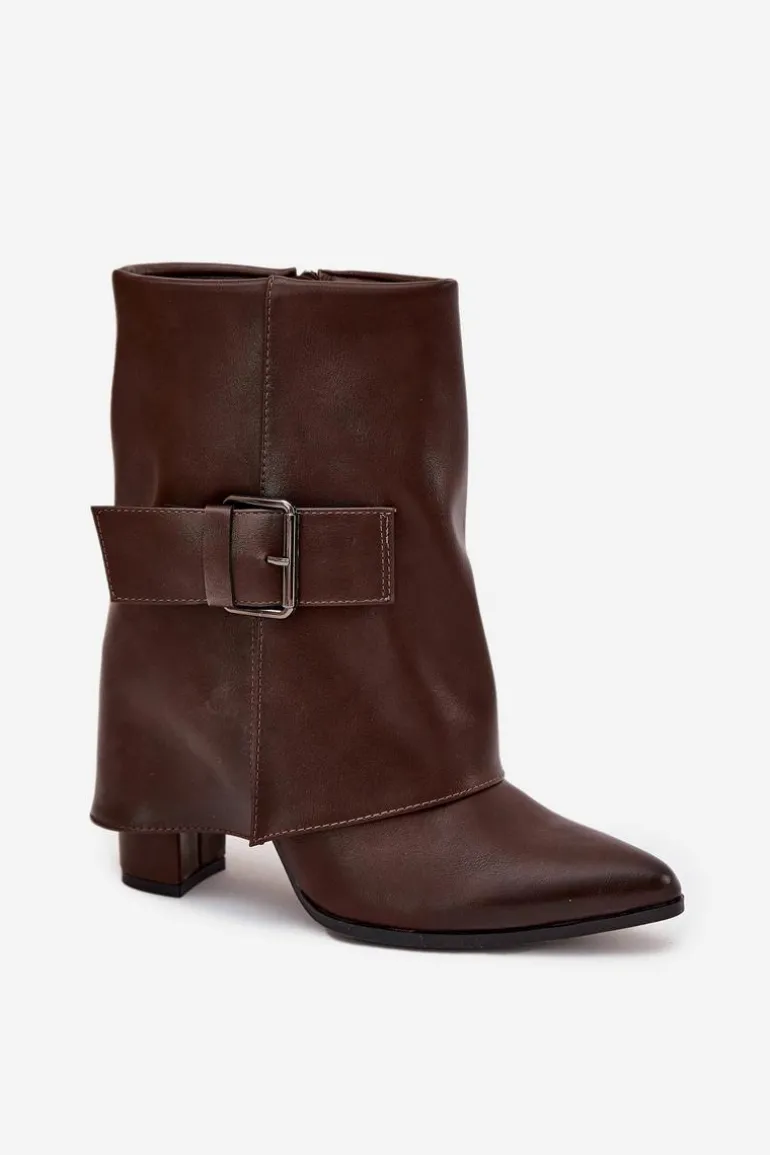 Modne botki z wywiniętą cholewką to doskonały wybór na sezon jesienno-zimowy. Osadzone na obcasie typu słupek, z noskami w szpic, optycznie wydłużają nogi, dodając sylwetce lekkości. Wykonane z eko skóry. Ocieplane kocem obuwniczym, gwarantują ciepło w chłodne dni. Duża klamra na cholewce stanowi subtelny, ale efektowny detal, który nadaje butom wyjątkowego charakteru. Zapinane na zamek. Idealne na każdą okazję, te botki będą eleganckim akcentem w Twoich stylizacjach. Przy wyborze rozmiaru prosimy sugerować się tabelą rozmiarów.