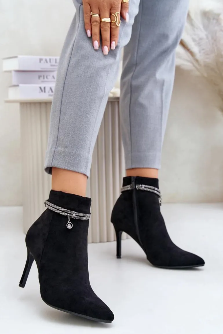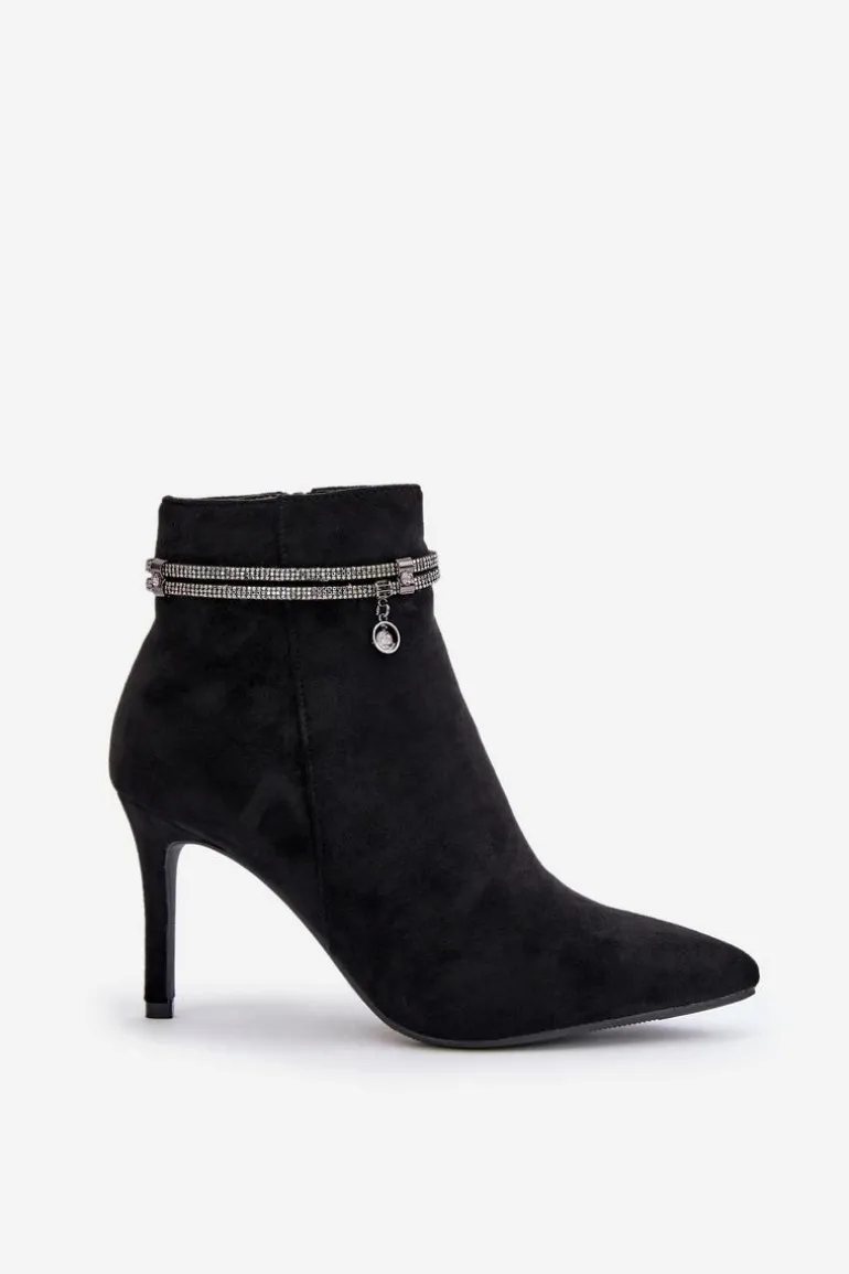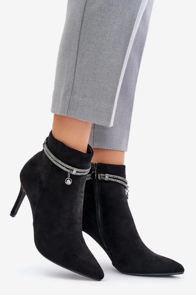 Eleganckie botki damskie wykonane z eko zamszu. Osadzone na obcasie w postaci szpilki. Na cholewce dwa zdobione paski, które nadają wyjątkowego uroku. Model zapinany na suwak z boku. Noski w szpic optycznie wysmuklą nogi. Dodatkowo zapiętek jest usztywniony. Idealnie sprawdzą się na wieczorne wyjścia! Przy wyborze rozmiaru prosimy sugerować się tabelą rozmiarów.