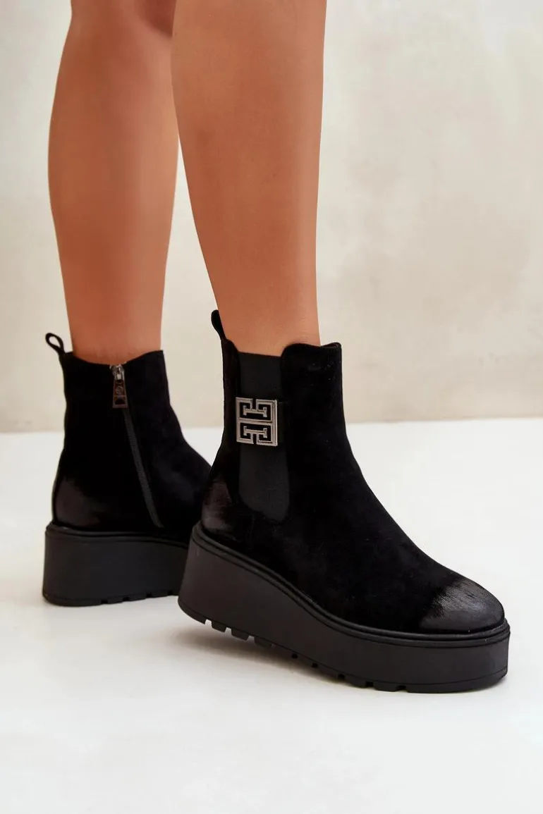 Botki wykonane z miękkiego eko zamszu, które idealnie łączą styl z komfortem. Osadzone na platformie i stabilnym koturnie, zapewniają wygodę noszenia przez cały dzień. Wnętrze ocieplone filcem. Zapinane na zamek, co ułatwia szybkie zakładanie i zdejmowanie. Noski zaokrąglone. Model ten doskonale uzupełni wiele różnych stylizacji, nadając im elegancji i komfortu. Przy wyborze rozmiaru prosimy kierować się tabelą rozmiarów