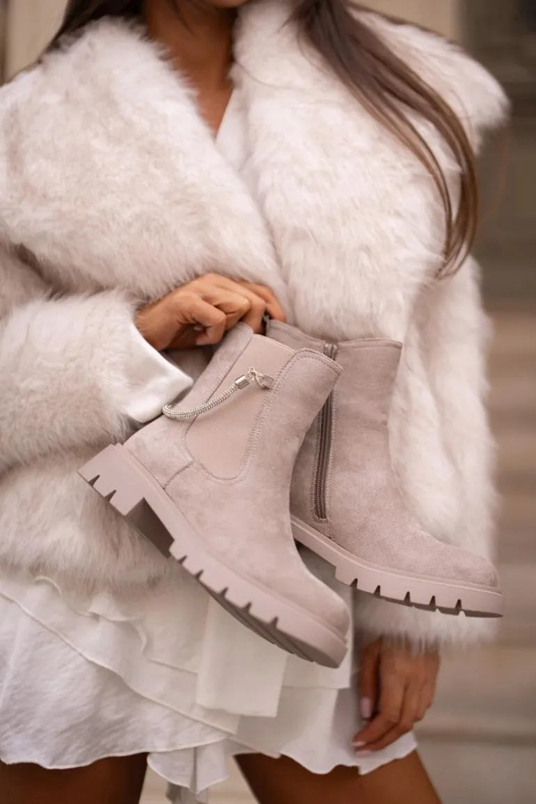 Botki damskie wykonane z eko zamszu. Model ten wyróżnia się ozdobnym, błyszczącym, odpinanym paseczkiem, który nadaje wyjątkowego uroku. Środek ocieplany kocem obuwniczym, co zapewni ciepło i komfort w chłodniejsze dni. Przy wyborze rozmiaru prosimy sugerować się tabelą rozmiarów.
