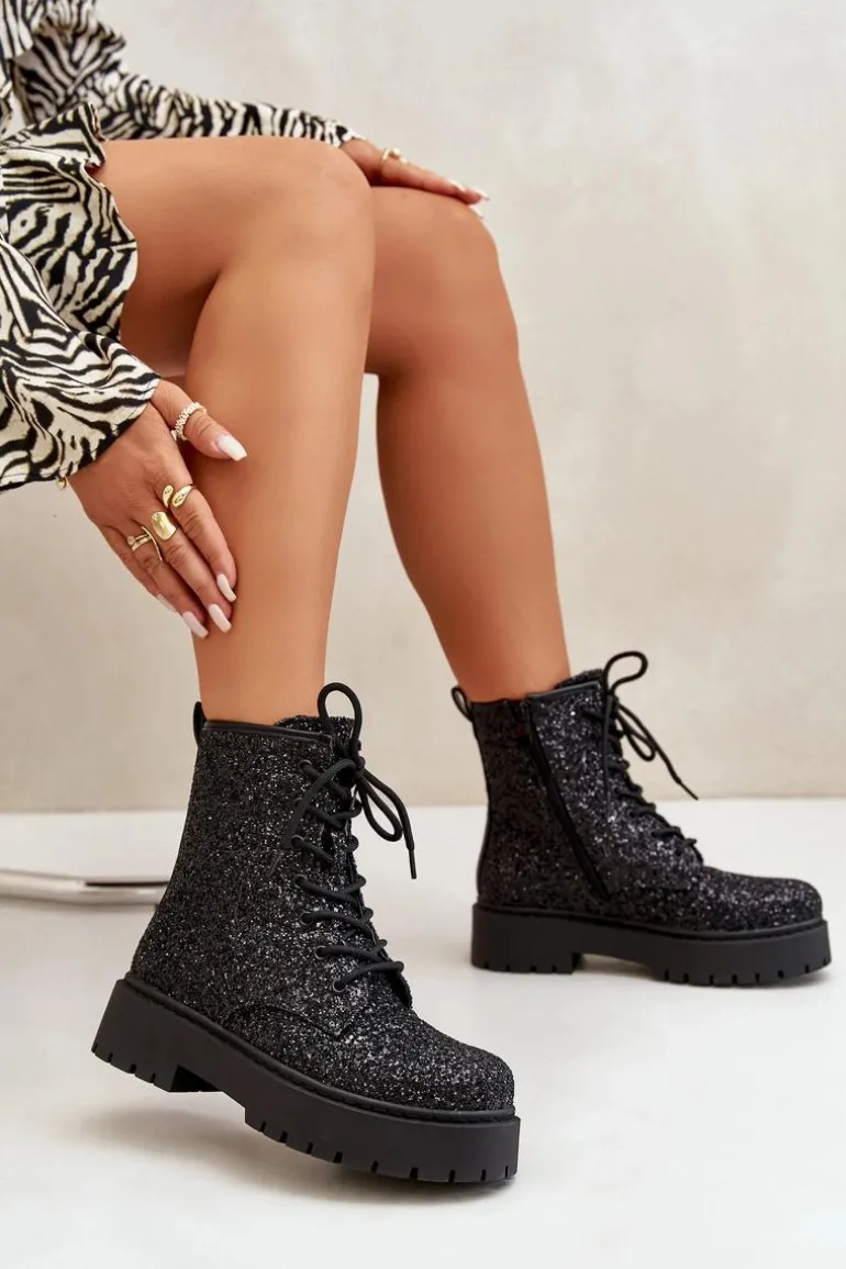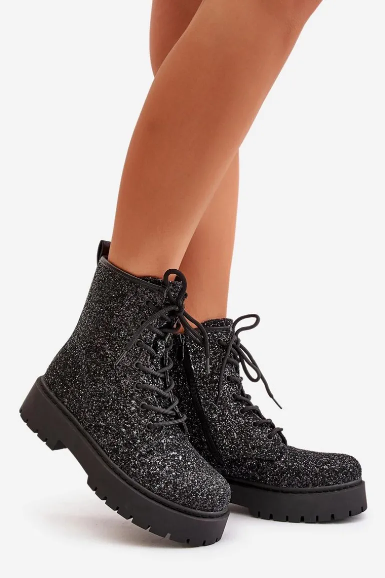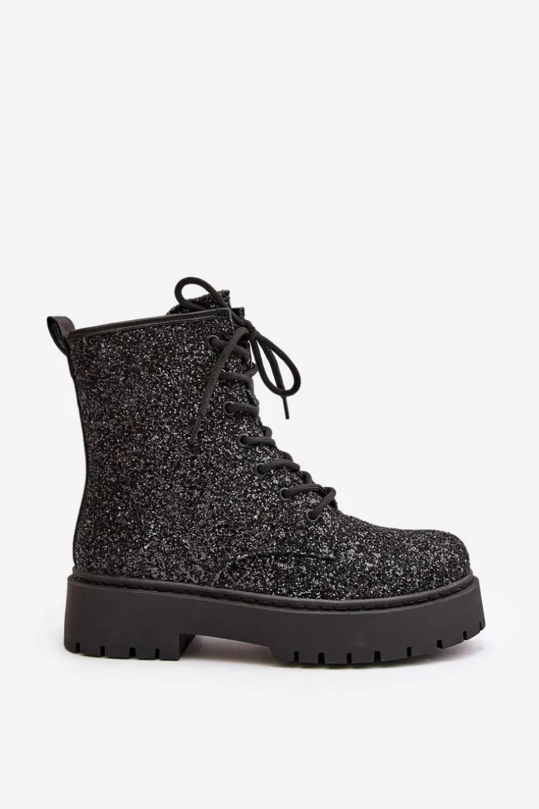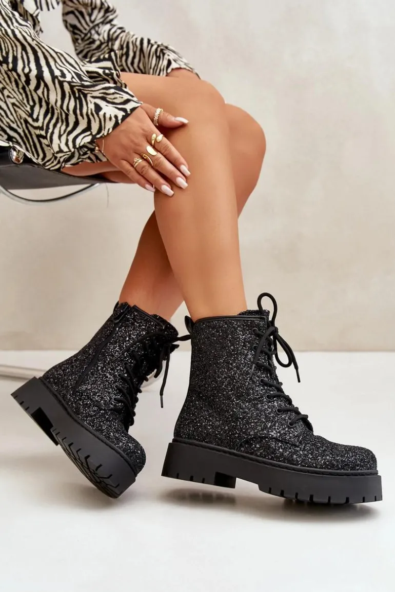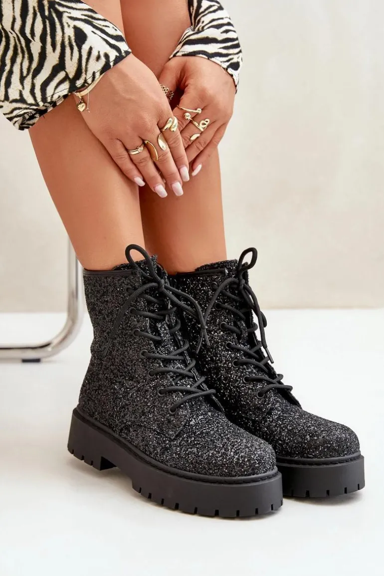 Ocieplane Botki Workery Damskie Ozdobione Cekinami Czarne Liatheine