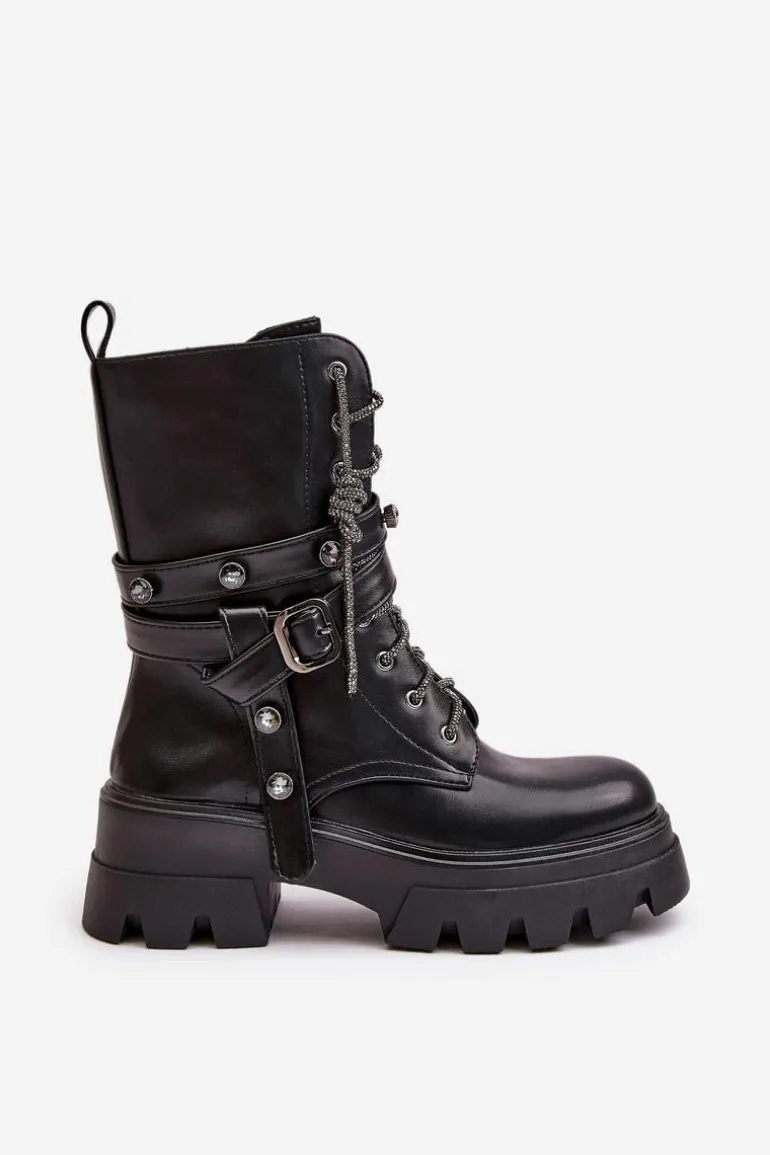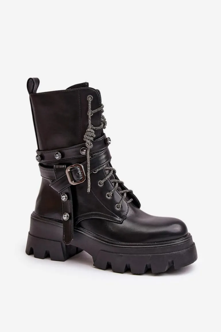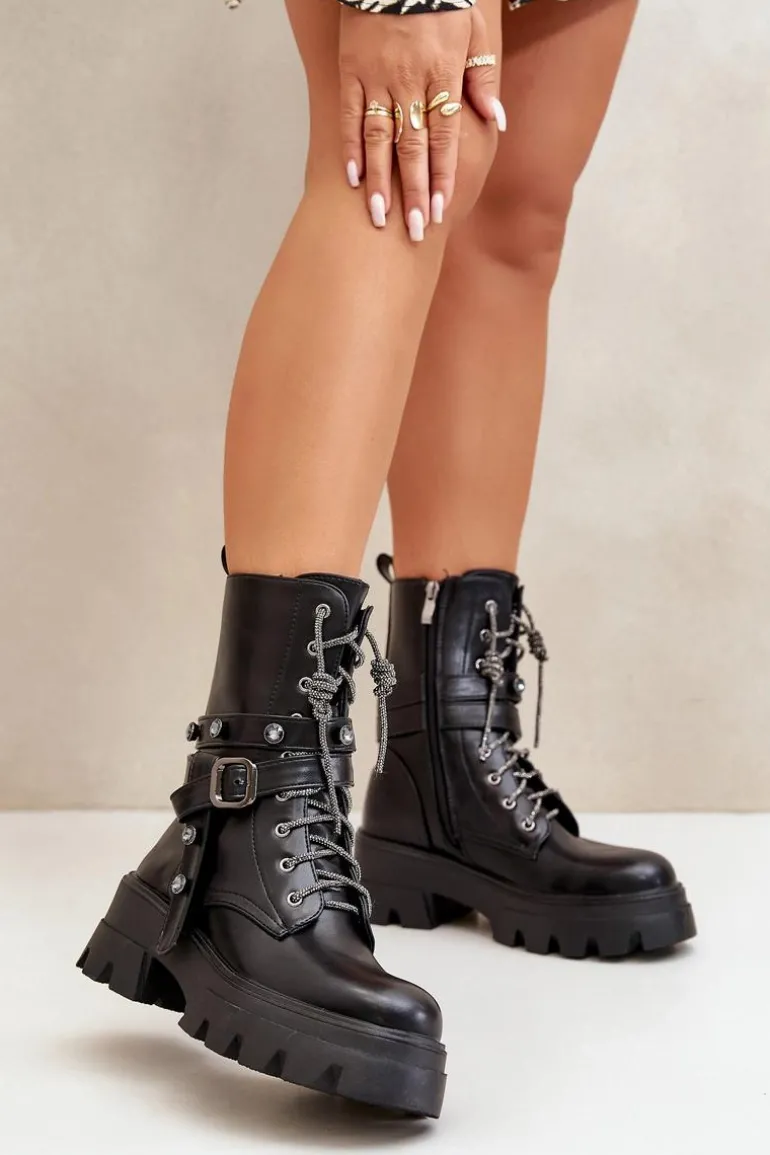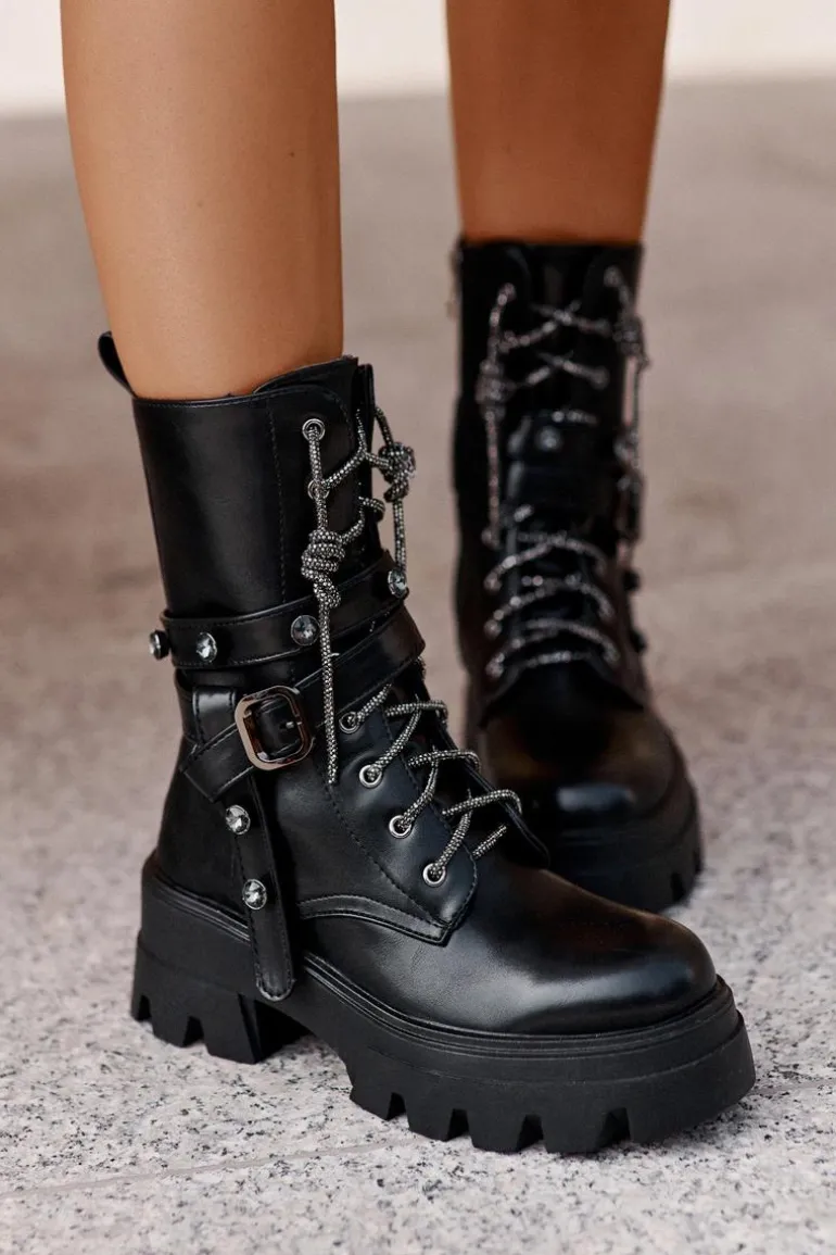 Damskie botki wykonane z ekologicznej skóry. Osadzone na płaskim, masywnym obcasie i platformie. Noski zaokrąglone. Środek ocieplony kocem obuwniczym. Zapinane na zamek oraz dodatkowo posiadają ozdobne sznurowanie. Na cholewce dwa paski z klamrą. Model ten doskonale uzupełni Twoje outfity w chłodniejsze dni! Przy wyborze rozmiaru prosimy sugerować się tabelą rozmiarów.