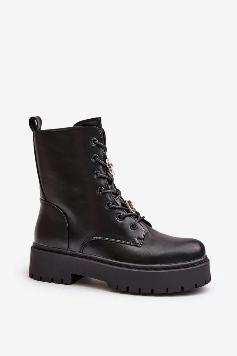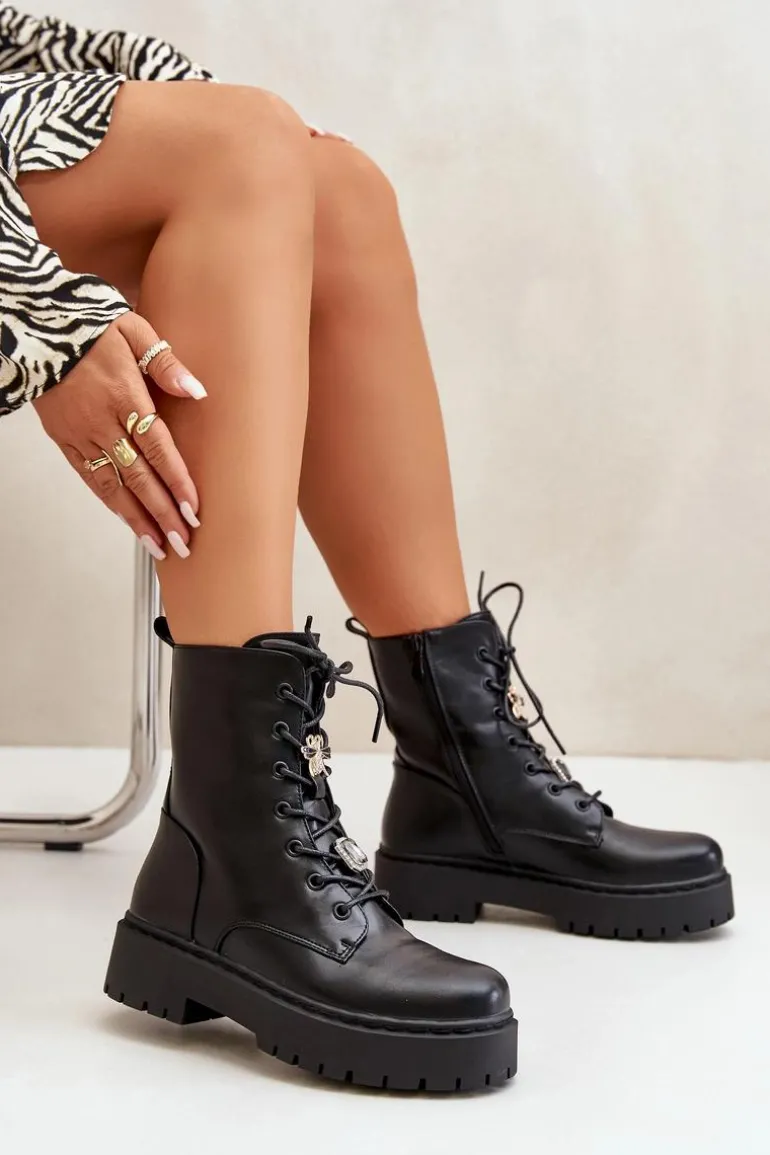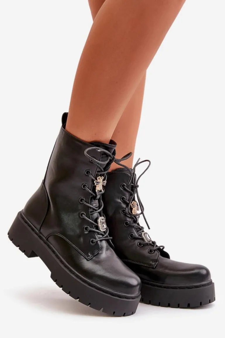 Damskie botki wykonane z ekologicznej skóry. Posiadają płaski obcas i zaokrąglone noski, co zapewnia komfort noszenia. Dzięki bocznemu suwakowi zakładanie jest szybkie i proste, a dodatkowe sznurowanie z ozdobnymi przypinkami dodaje unikalnego charakteru. Środek ocieplony kocem obuwniczym. Doskonale uzupełnią Twoje outfity w chłodniejsze dni.Przy wyborze rozmiaru prosimy sugerować się tabelą rozmiarów.