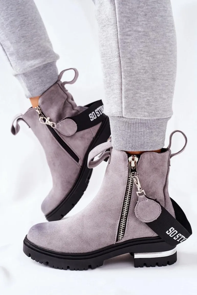Botki damskie wykonane z eko zamszu. Wnętrze ocieplone jest miłym w dotyku kocem obuwniczym. Przy wyborze rozmiaru prosimy sugerować się tabelą rozmiarów.