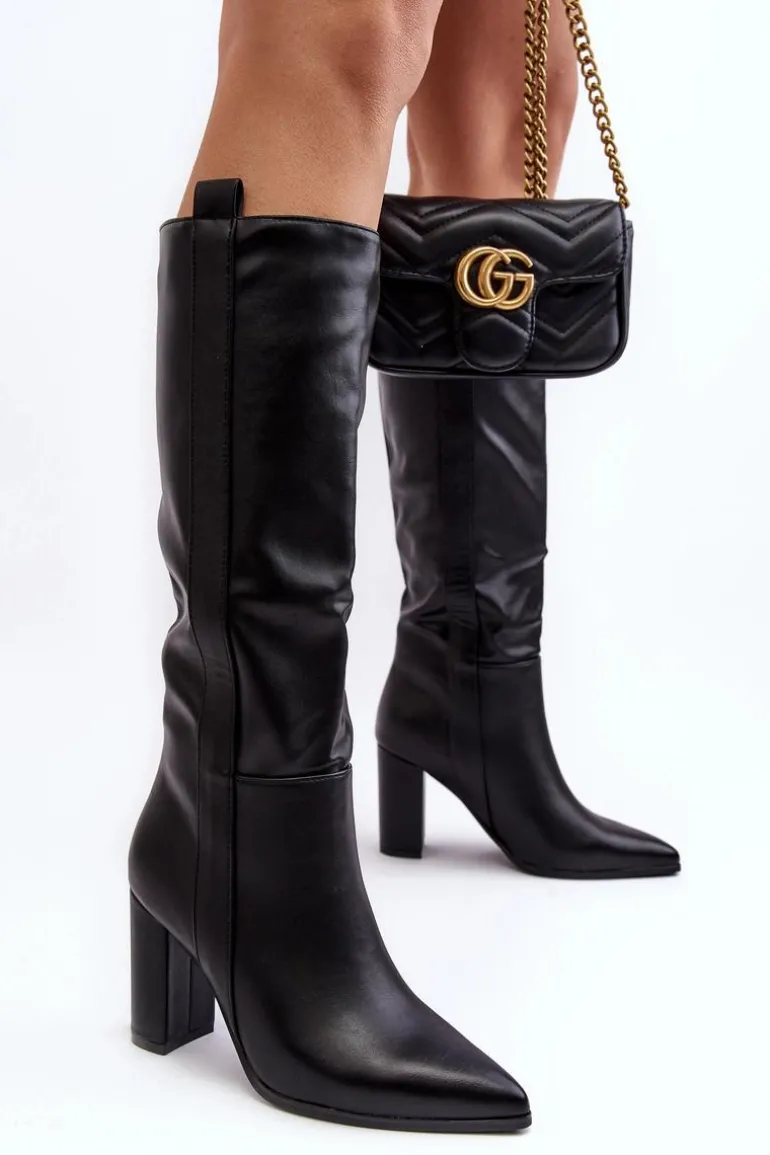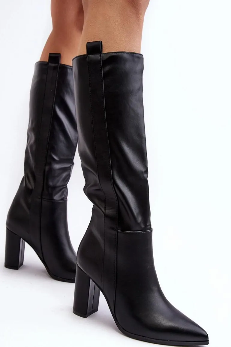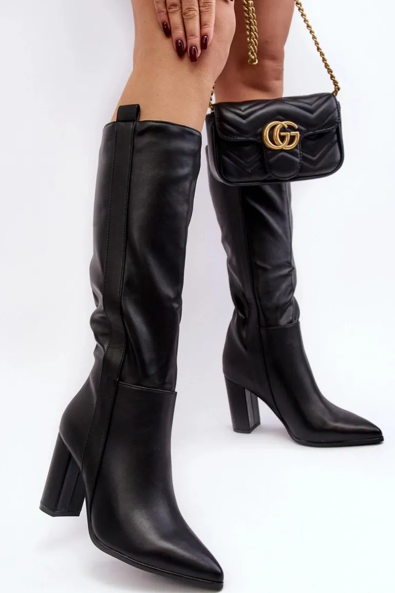 Eleganckie kozaki damskie z eko skóry to wyjątkowy model, który z pewnością podkreśli styl każdej kobiety. Wykonane z eko skóry. Osadzone na obcasie w postaci słupka. Noski w szpic optycznie wysmuklą nogi. Model wsuwany, cholewka przed kolano. Środek ocieplony kocem obuwniczym. Koniecznie musisz je mieć! Przy wyborze rozmiaru prosimy sugerować się tabelą rozmiarów.
