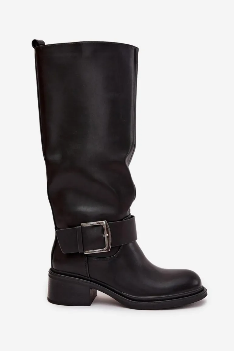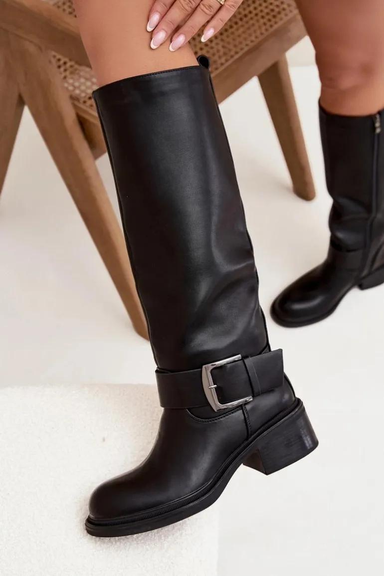 Ocieplane Kozaki Damskie Na Klocku Z Klamrą Czarne Raphaela