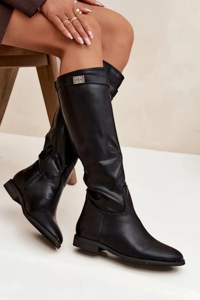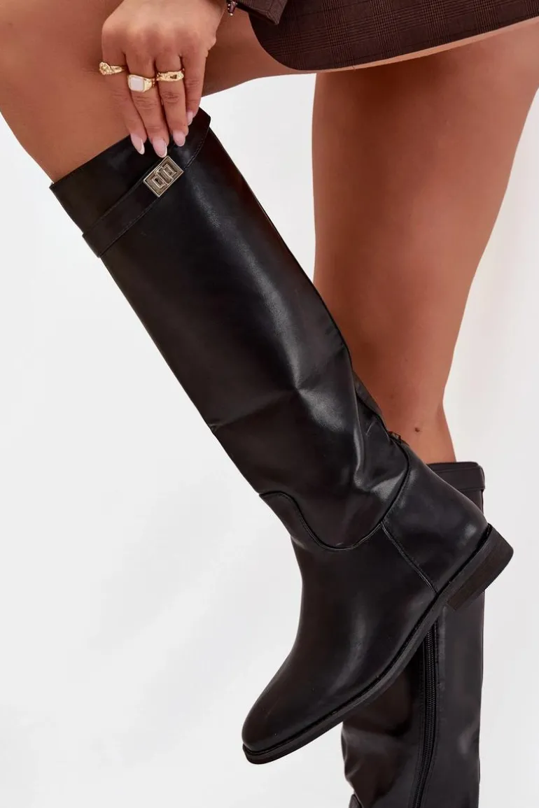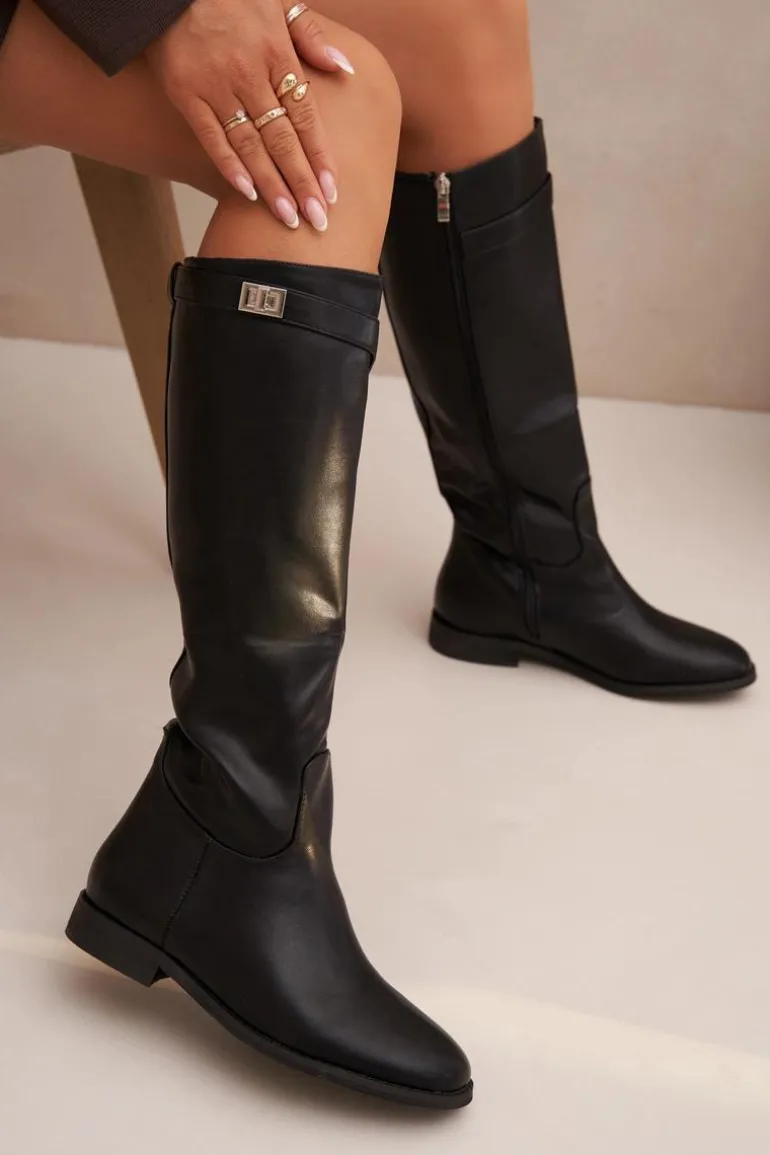 Stylowe kozaki damskie wykonane z eko skóry, to doskonały wybór na chłodniejsze dni. Osadzone na płaskim obcasie gwarantują wygodę i komfort podczas codziennego noszenia. Klasyczne, zaokrąglone noski nadają im uniwersalnego charakteru, a ocieplenie wewnątrz buta zapewnia ciepło. Kozaki zapinane są na praktyczny zamek, który ułatwia zakładanie. Na górze cholewki znajdują się pasek z ozdobnym detalem, dodający całości elegancji i modnego akcentu. Model idealny zarówno do spodni, jak i sukienek. Przy wyborze rozmiaru prosimy sugerować się tabelą rozmiarów.