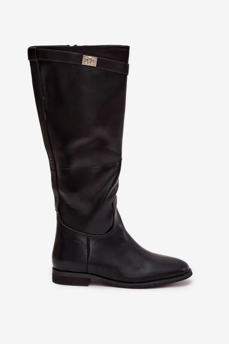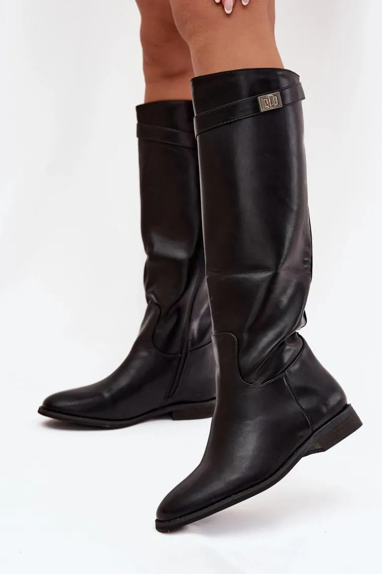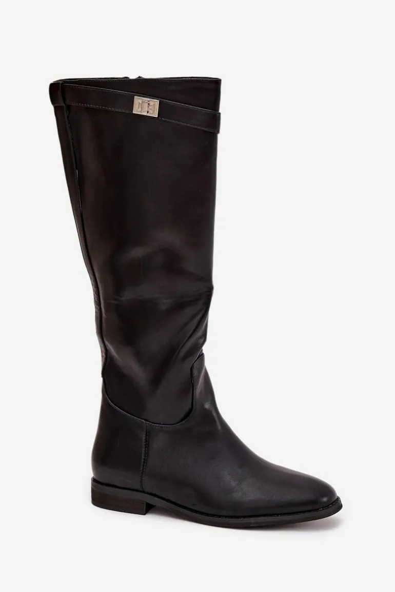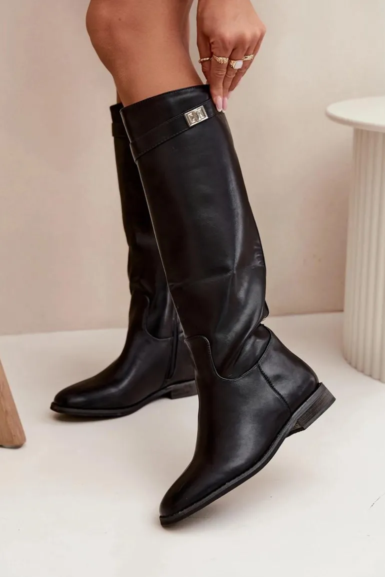 Stylowe kozaki damskie wykonane z eko skóry, to doskonały wybór na chłodniejsze dni. Osadzone na płaskim obcasie gwarantują wygodę i komfort podczas codziennego noszenia. Klasyczne, zaokrąglone noski nadają im uniwersalnego charakteru, a ocieplenie wewnątrz buta zapewnia ciepło. Kozaki zapinane są na praktyczny zamek, który ułatwia zakładanie. Na górze cholewki znajdują się pasek z ozdobnym detalem, dodający całości elegancji i modnego akcentu. Model idealny zarówno do spodni, jak i sukienek. Przy wyborze rozmiaru prosimy sugerować się tabelą rozmiarów.
