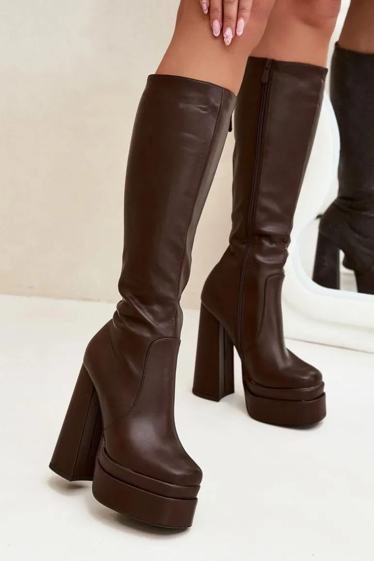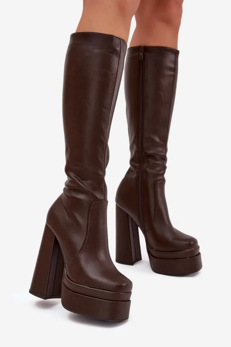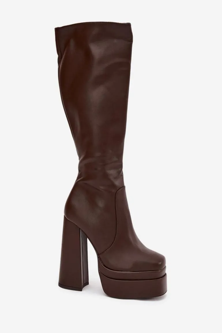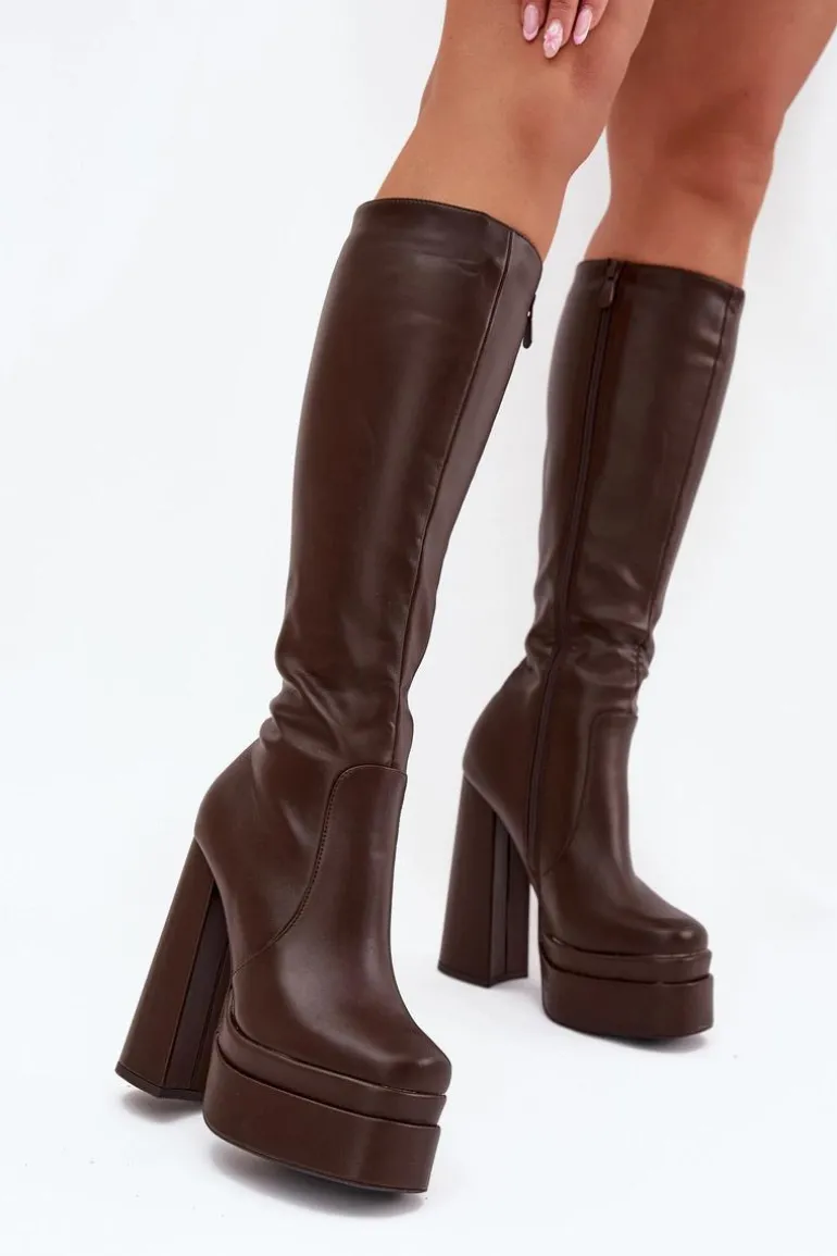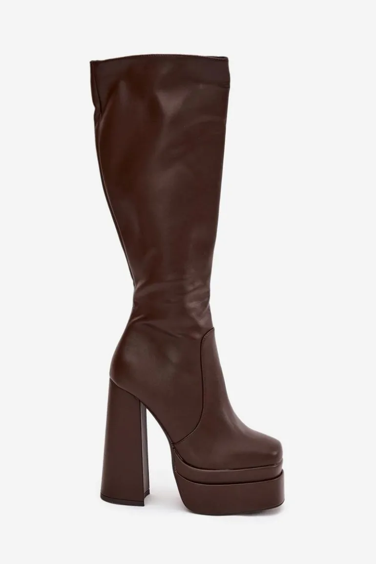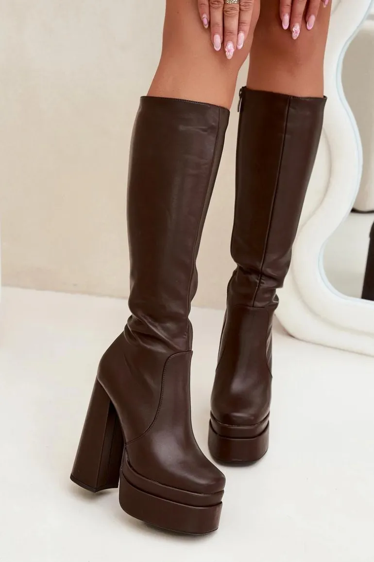 Kozaki damskie z eko skóry, osadzone na obcasie w formie słupka i platformie. Zapinane na zamek, zapewniają łatwość zakładania, a zaokrąglone noski dodają komfortu. Cholewka sięgająca do kolana, wraz z ociepleniem kocem obuwniczym, zapewnia ciepło i komfort nawet w chłodniejsze dni. Te kozaki doskonale komponują się z zimowymi stylizacjami. Przy wyborze rozmiaru prosimy sugerować się tabelą rozmiarów.