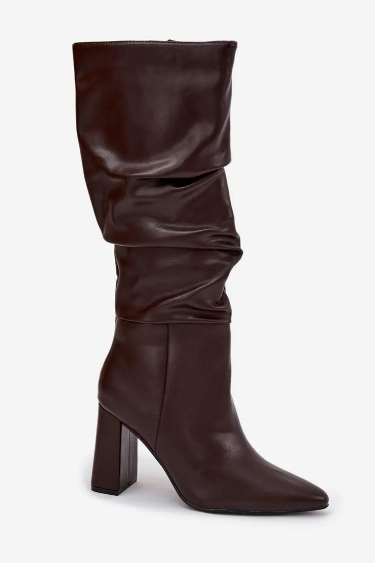 Kozaki damskie wykonane z eko skóry. Stabilny obcas typu słupek zapewnia komfort chodzenia, a noski w kształcie migdała dodają klasycznego charakteru. Marszczona cholewka nadaje modnego i niebanalnego wyglądu, dzięki czemu świetnie wyróżniają się w stylizacji. Kozaki zapinane są na praktyczny zamek, co ułatwia ich zakładanie i zdejmowanie. Idealne zarówno do spodni, jak i sukienek – sprawdzą się w wielu codziennych oraz eleganckich outfitach. Przy wyborze rozmiaru prosimy sugerować się tabelą rozmiarów.