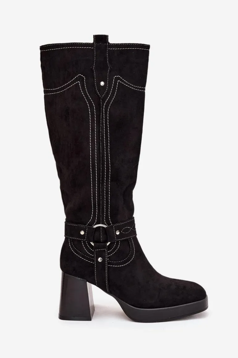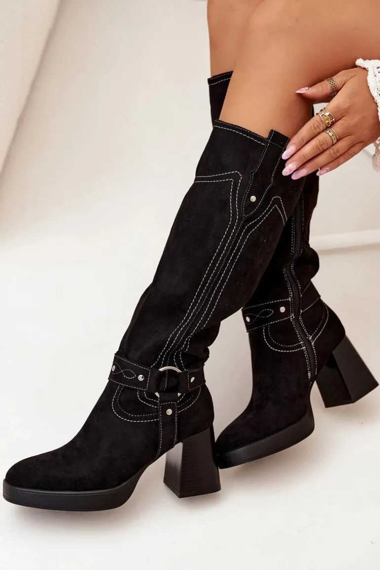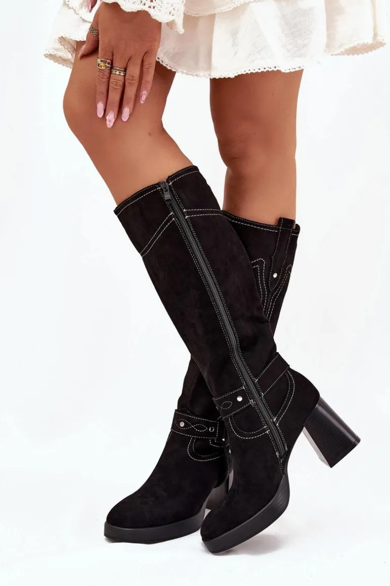 Ocieplane Kozaki Damskie Na Słupku Z Przeszyciami Czarne Alessara