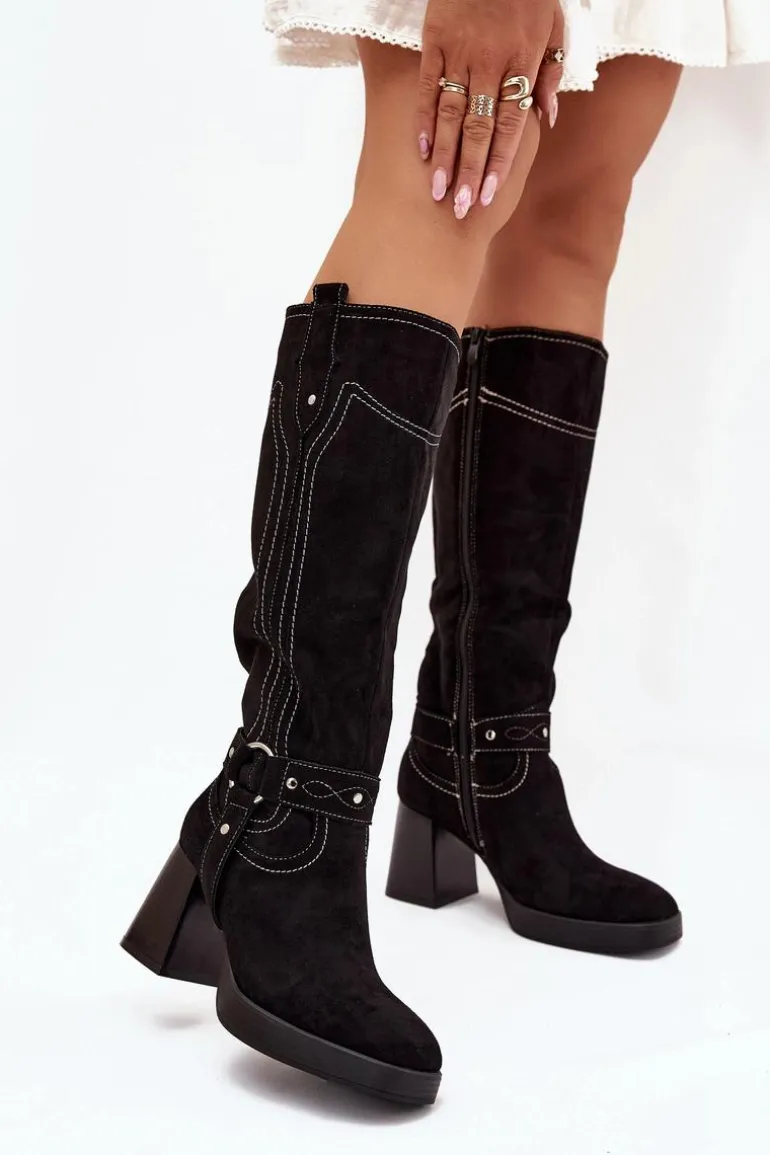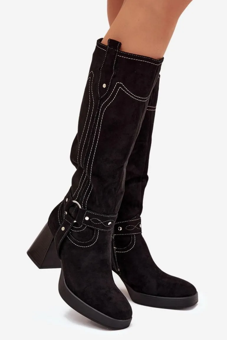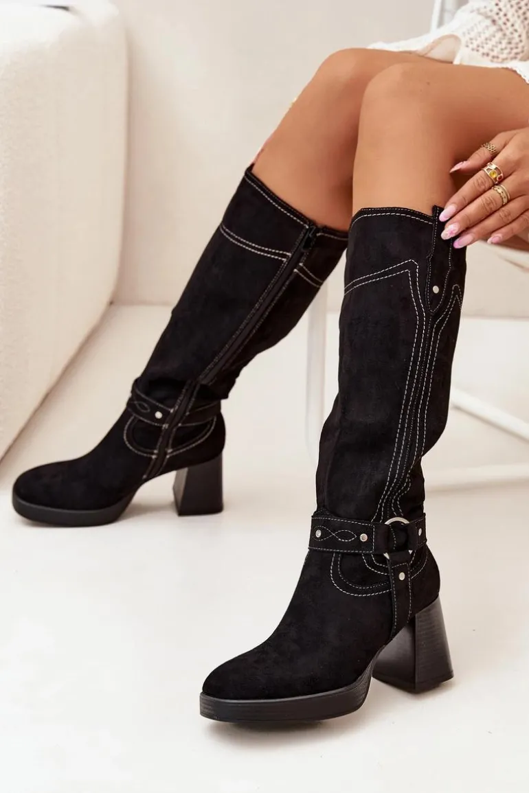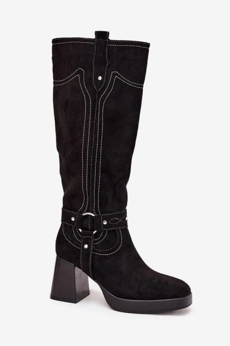 Ocieplane Kozaki Damskie Na Słupku Z Przeszyciami Czarne Alessara