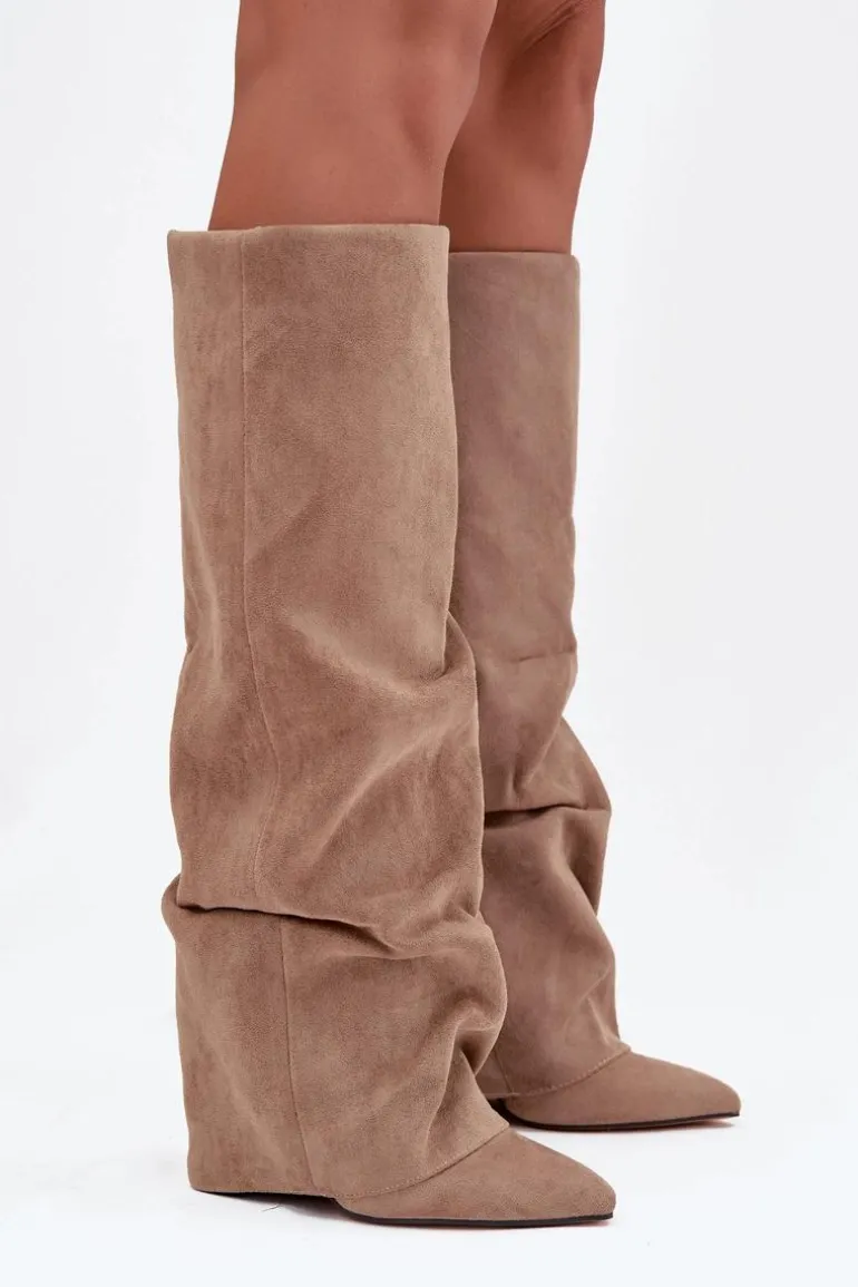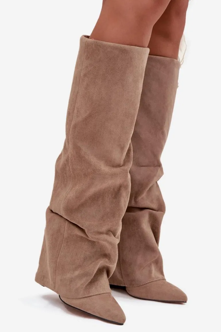 Kozaki damskie z wywiniętą cholewką to prawdziwy must-have na nadchodzący sezon jesienno-zimowy! Wsuwane i osadzone na stabilnym obcasie typu słupek, gwarantują wygodę i pewny krok. Ocieplenie zapewnia komfort w chłodniejsze dni, a wywinięta cholewka, nachodząca na obcas, dodaje im oryginalnego charakteru. Szpiczaste noski podkreślają kobiecy styl, dzięki czemu kozaki świetnie sprawdzą się w efektownych, zimowych stylizacjach. Przy wyborze rozmiaru prosimy sugerować się tabelą rozmiarów.