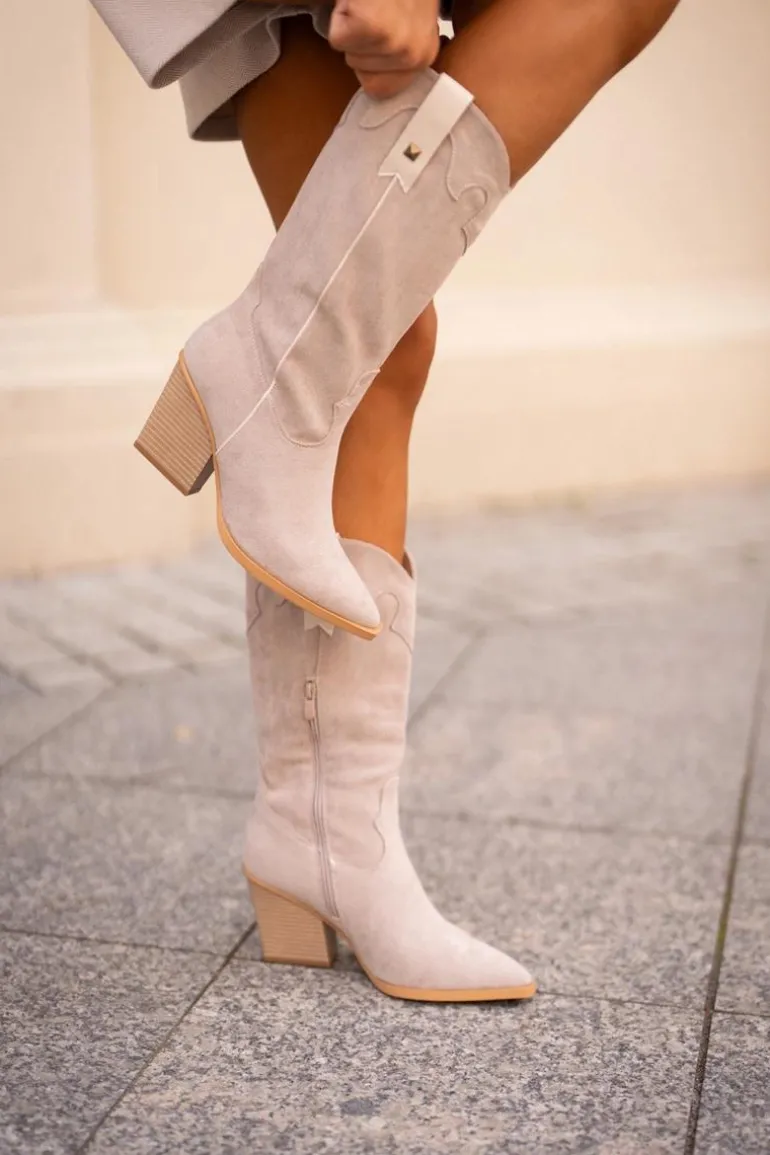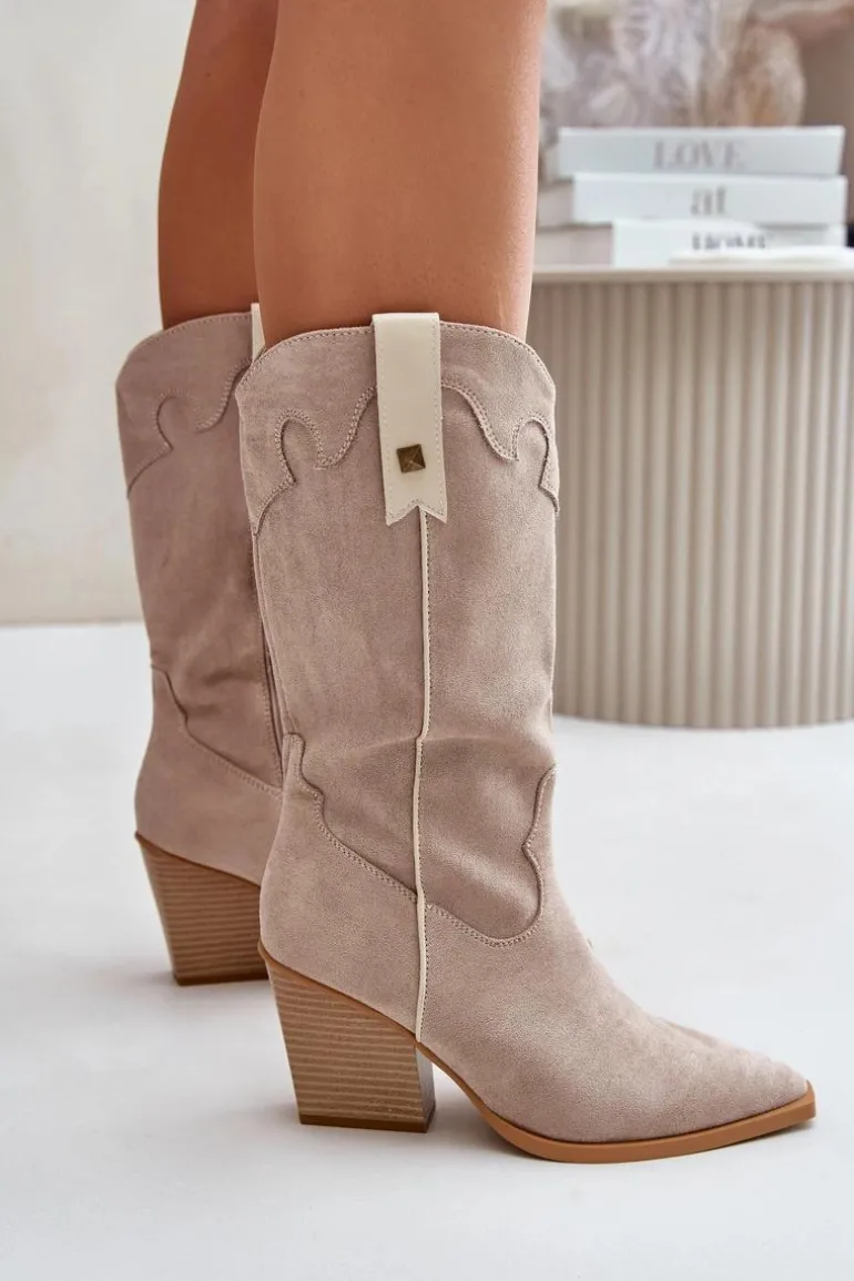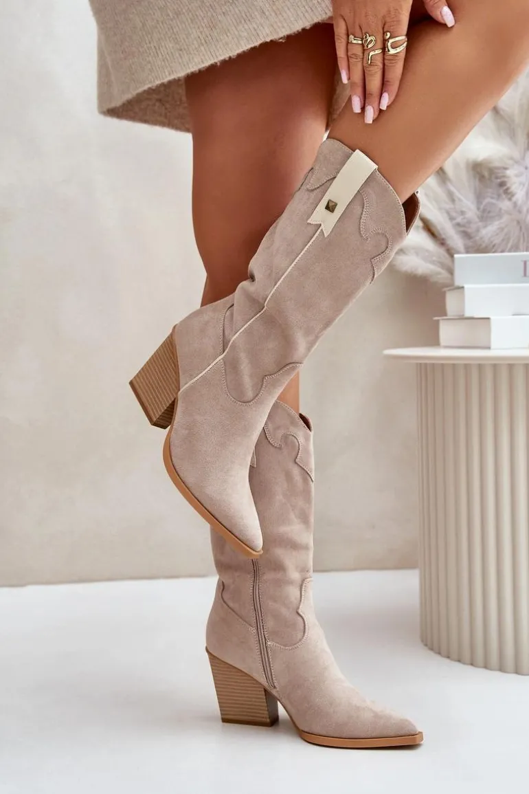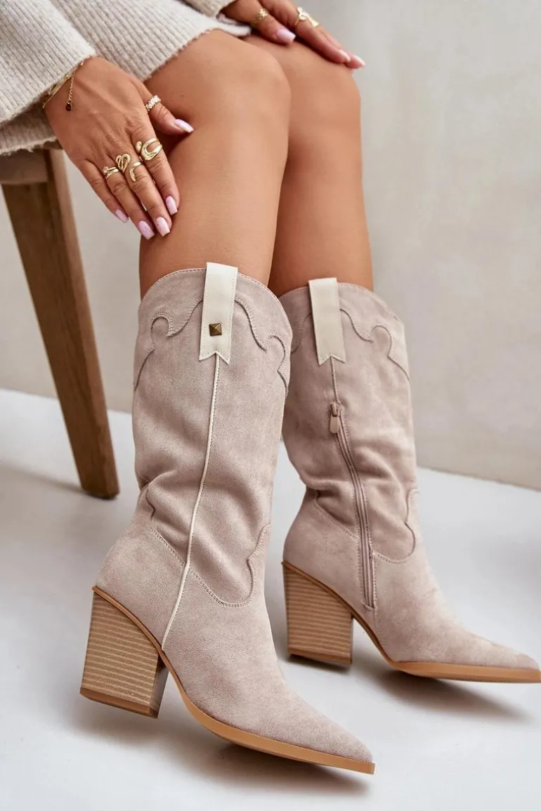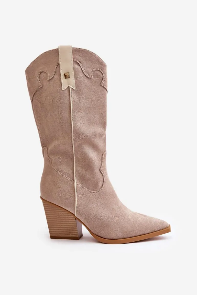 Kozaki damskie wykonane z eko zamszu. Osadzone na obcasie w formie słupka. Noski w szpic. Środek ocieplany kocem obuwniczym. Cholewka sięga do połowy łydki. Ten model skradnie serce niejednej miłośniczce kozaków w stylu kowbojek! Świetnie sprawdzą się podczas jesienno-zimowych stylizacji! Przy wyborze rozmiaru prosimy sugerować się tabelą rozmiarów.