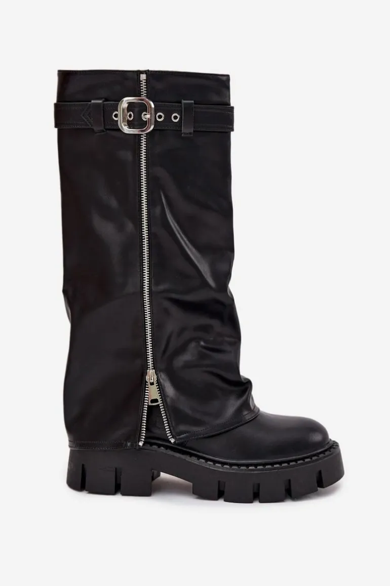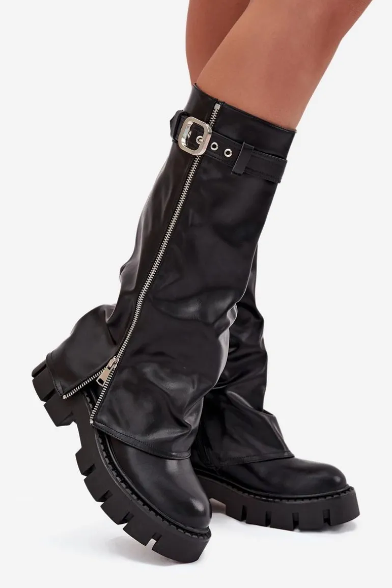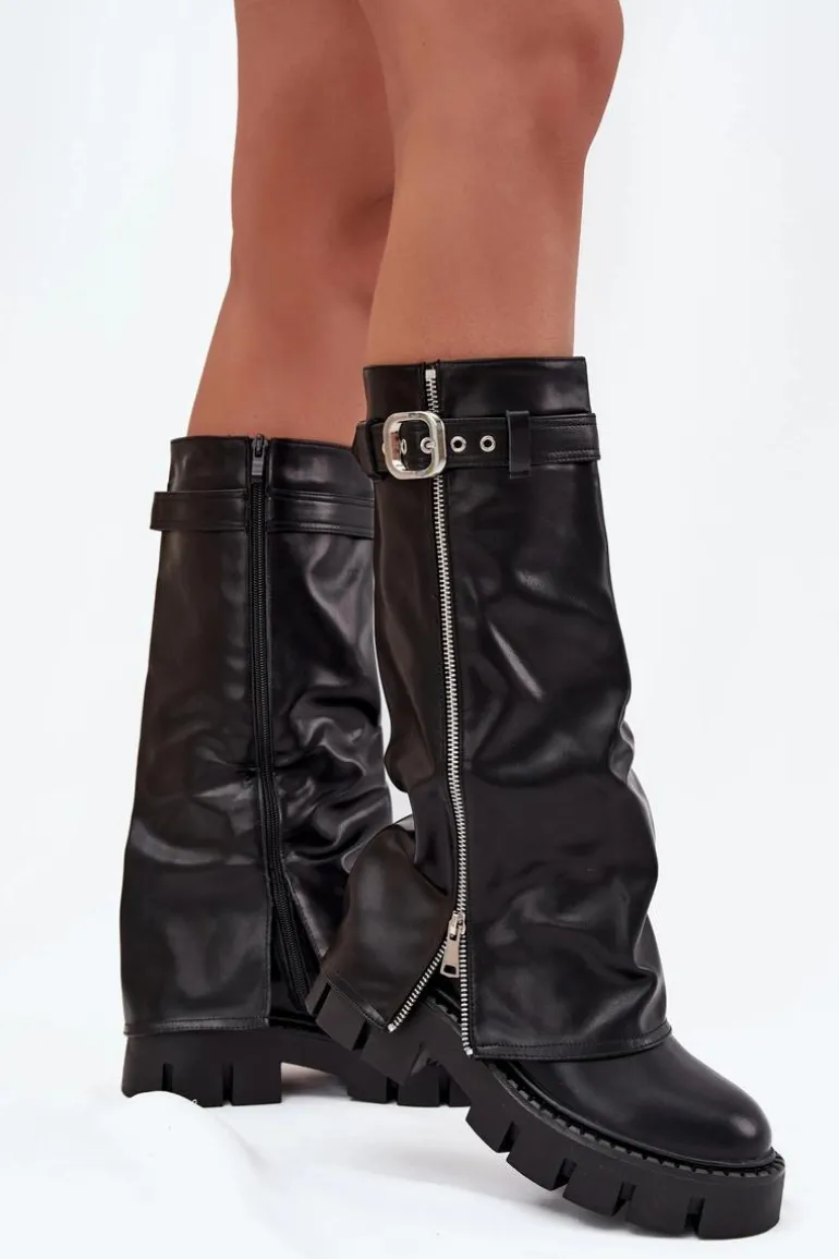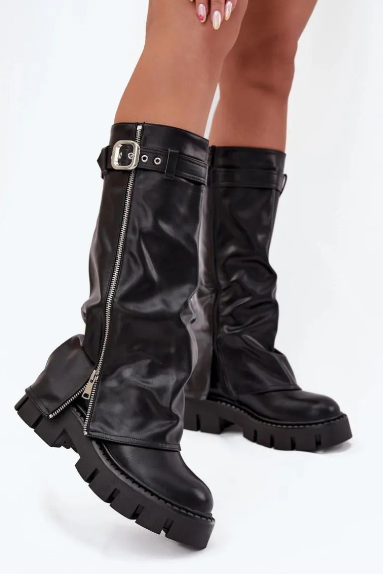 Damskie kozaki z wywinięta cholewką to zdecydowany hit wśród zimowych trendów. Wykonane z eko skóry. Osadzone na platformie wraz z masywnym obcasem. Ocieplane kocem obuwniczym, zapewniają komfort i ciepło w chłodniejsze dni. Wygodne w zakładaniu dzięki zapięciu na zamek błyskawiczny, a dodatkowy srebrny zamek oraz pasek z klamrą na górze cholewki nadają im modny, wyrazisty charakter. Doskonale sprawdzą się zarówno w codziennych, jak i bardziej eleganckich stylizacjach. Przy wyborze rozmiaru prosimy kierować tabelą rozmiarów.