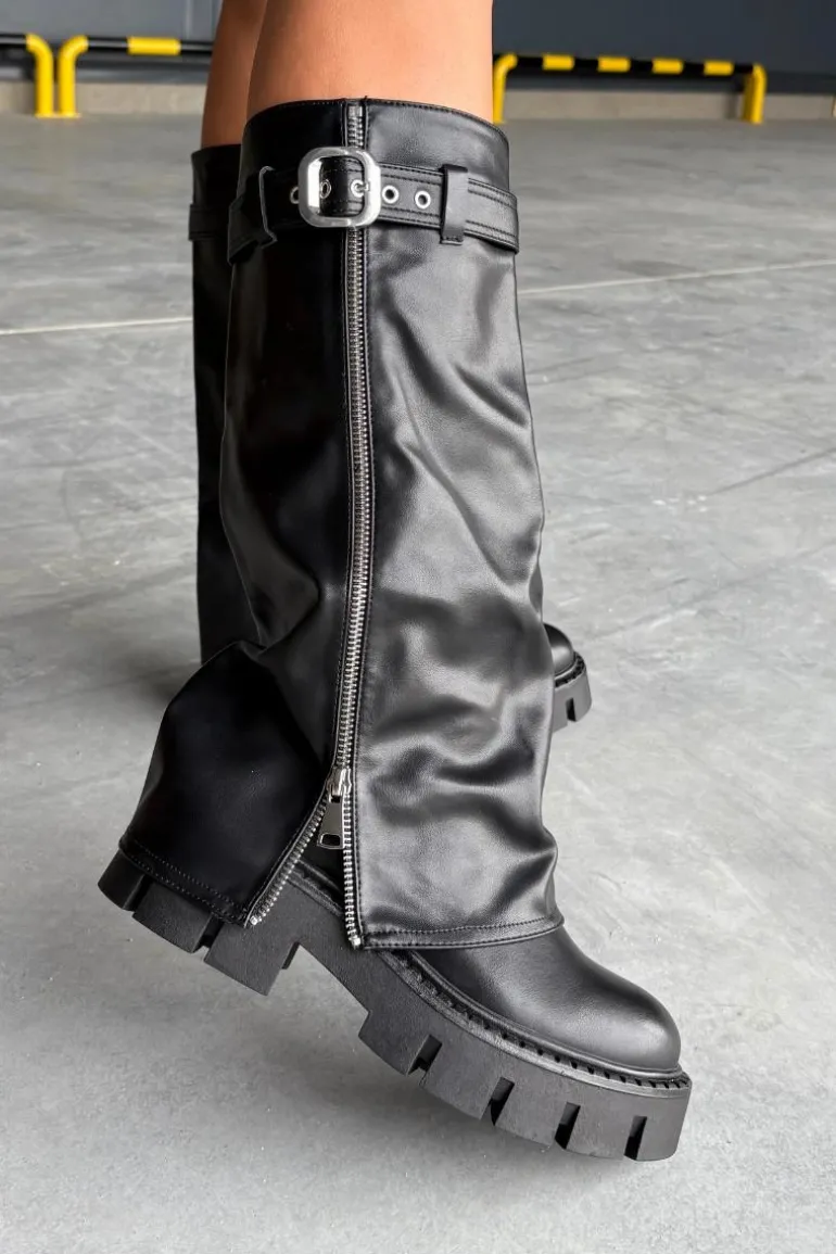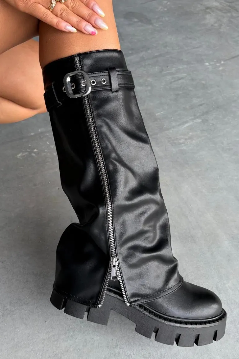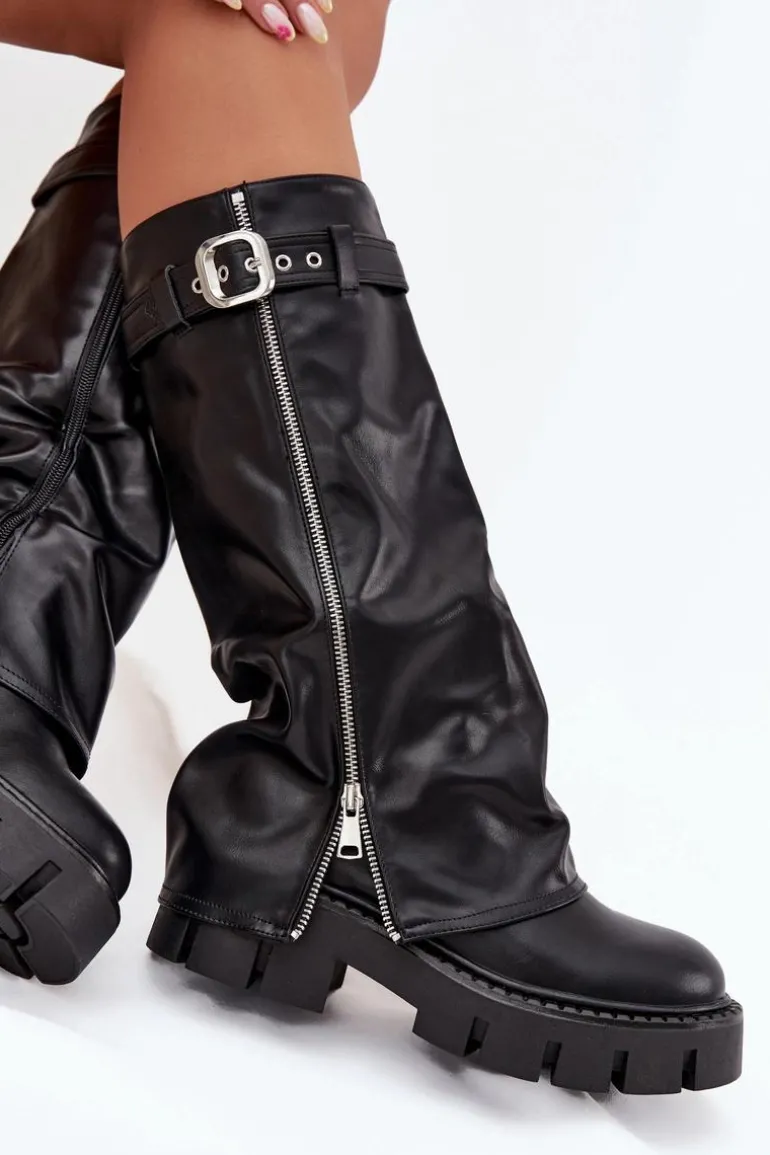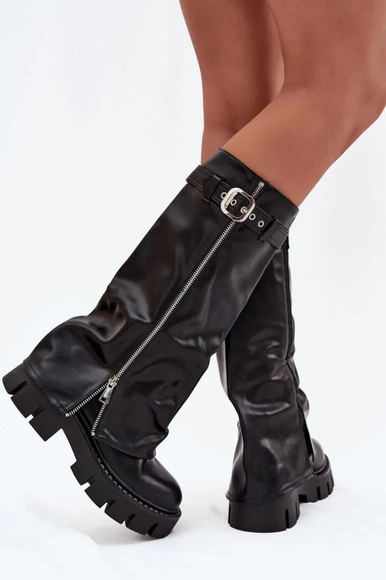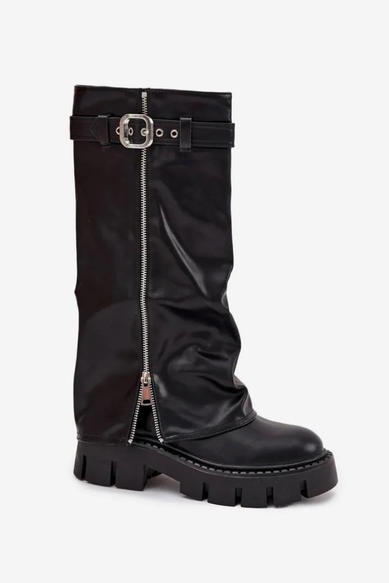 Damskie kozaki z wywinięta cholewką to zdecydowany hit wśród zimowych trendów. Wykonane z eko skóry. Osadzone na platformie wraz z masywnym obcasem. Ocieplane kocem obuwniczym, zapewniają komfort i ciepło w chłodniejsze dni. Wygodne w zakładaniu dzięki zapięciu na zamek błyskawiczny, a dodatkowy srebrny zamek oraz pasek z klamrą na górze cholewki nadają im modny, wyrazisty charakter. Doskonale sprawdzą się zarówno w codziennych, jak i bardziej eleganckich stylizacjach. Przy wyborze rozmiaru prosimy kierować tabelą rozmiarów.