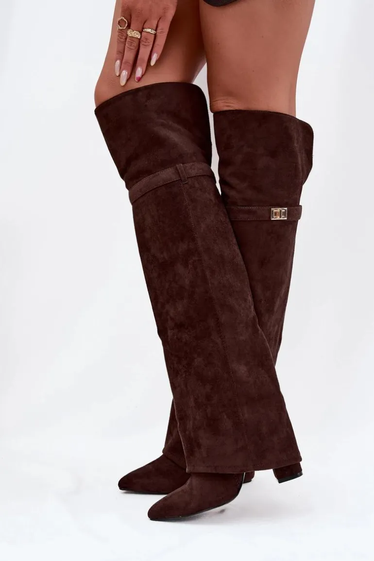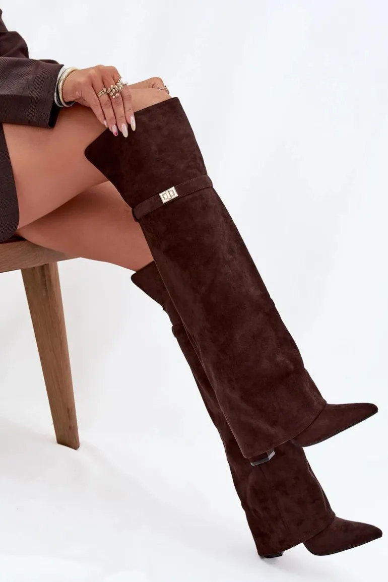 Kozaki damskie z wywiniętą cholewką to prawdziwy hit nadchodzącego sezonu jesienno-zimowego! Cholewka sięga za kolano i nachodzi na obcas dodaje im niepowtarzalnego charakteru. Osadzone na stabilnym obcasie typu słupek, zapewniają komfort i elegancję, a ocieplenie gwarantuje ciepło w chłodniejsze dni. Wsuwane i z noskami w szpic, łączą w sobie wygodę z modnym, kobiecym stylem – idealne do tworzenia efektownych, zimowych stylizacji. Przy wyborze rozmiaru prosimy sugerować się tabelą rozmiarów.