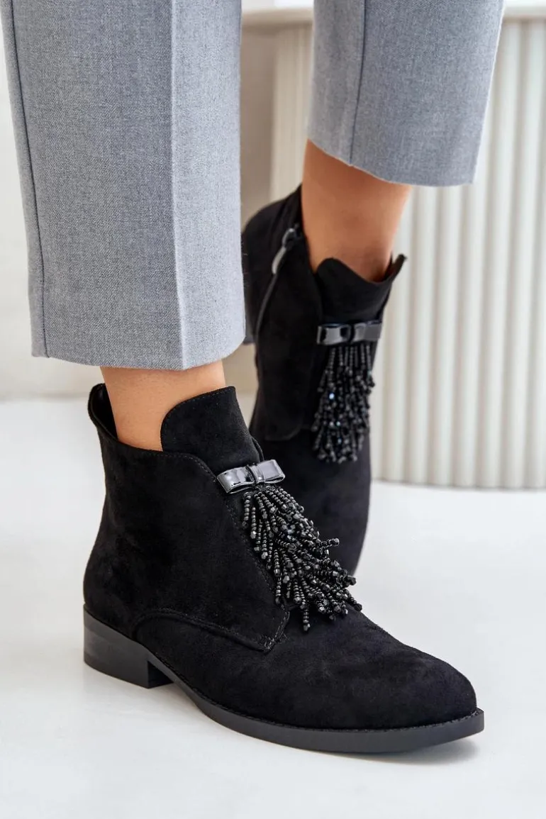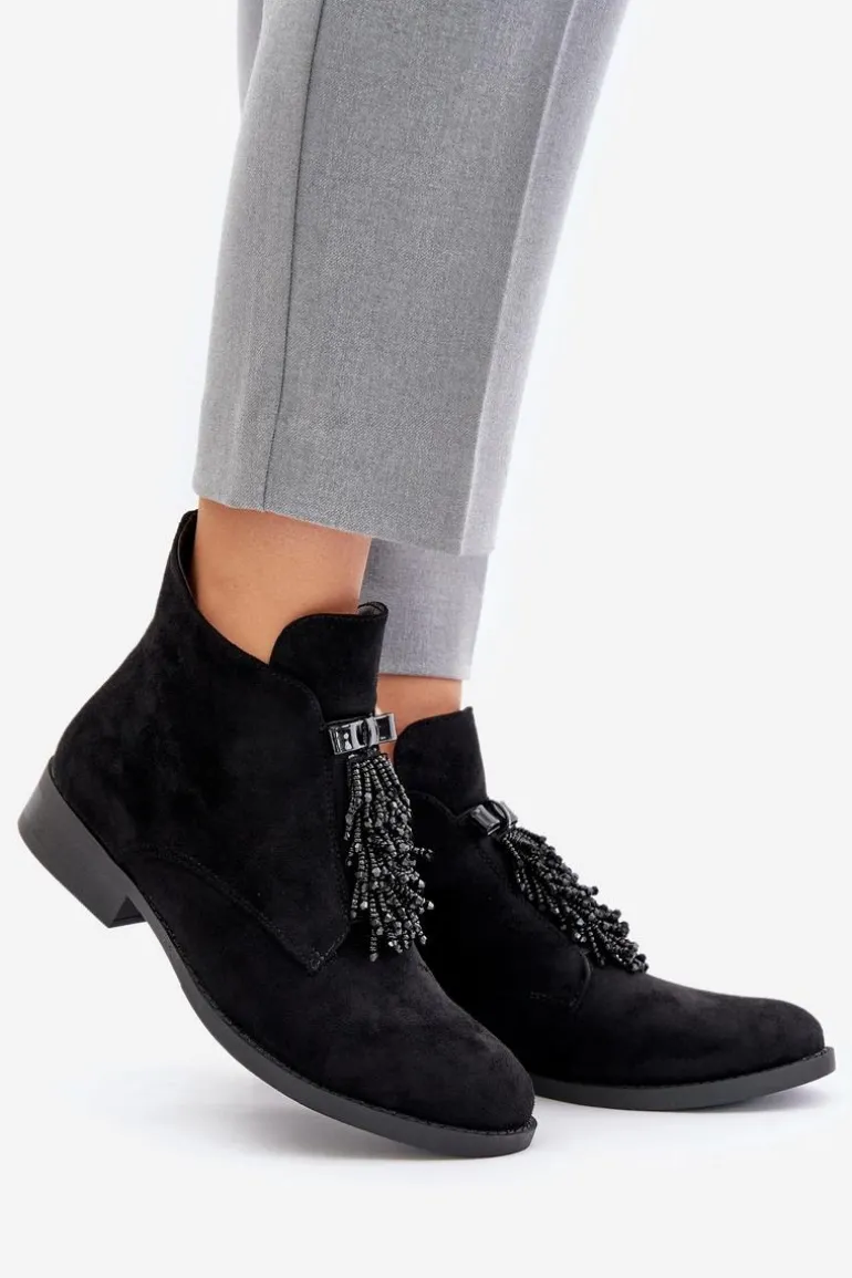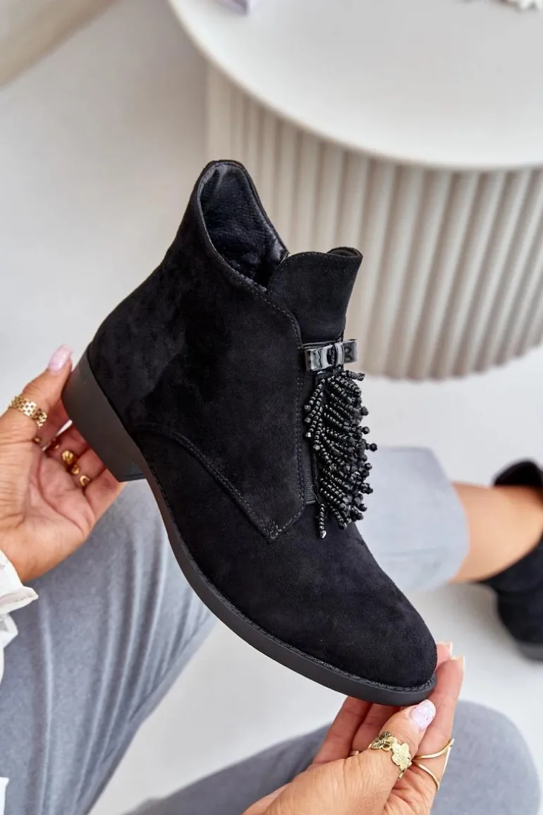 Botki damskie z cholewką do kostki od marki S.Barski. Wykonane z eko zamszu. Osadzone na płaskim obcasie, który zapewni stabilność na każdym kroku. Noski zaokrąglone. Głównym atutem tego modelu jest ozdoba z przodu, która nadaje wyjątkowego uroku. Model ten posiada ocieplenie w postaci koca obuwniczego. Przy wyborze rozmiaru prosimy sugerować się tabelą rozmiarów.