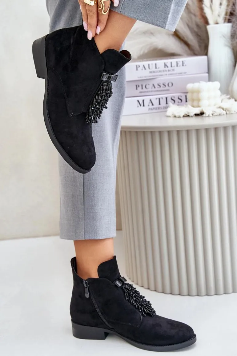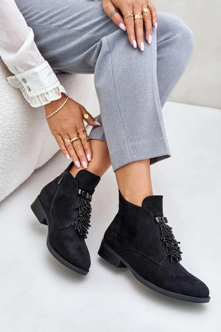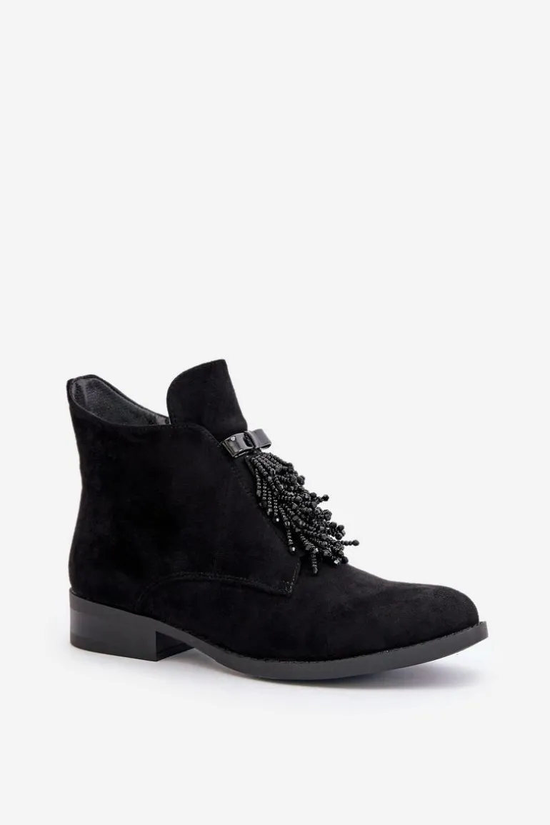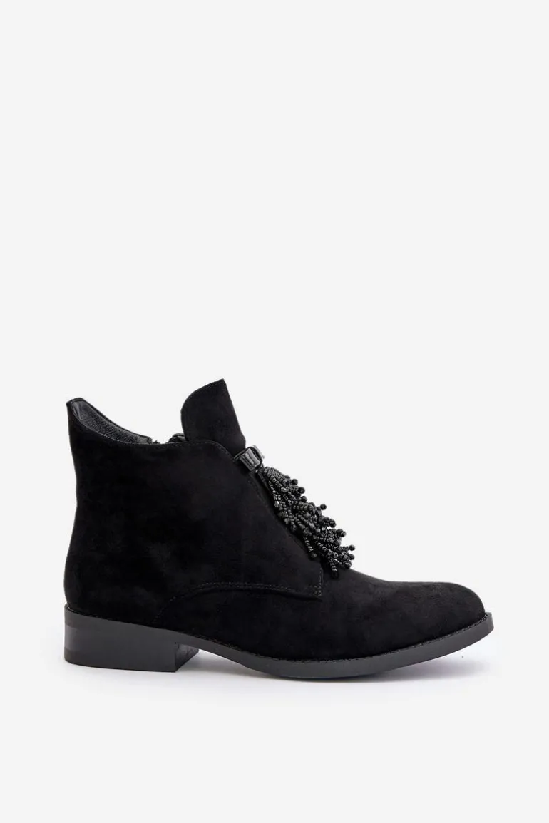 Botki damskie z cholewką do kostki od marki S.Barski. Wykonane z eko zamszu. Osadzone na płaskim obcasie, który zapewni stabilność na każdym kroku. Noski zaokrąglone. Głównym atutem tego modelu jest ozdoba z przodu, która nadaje wyjątkowego uroku. Model ten posiada ocieplenie w postaci koca obuwniczego. Przy wyborze rozmiaru prosimy sugerować się tabelą rozmiarów.