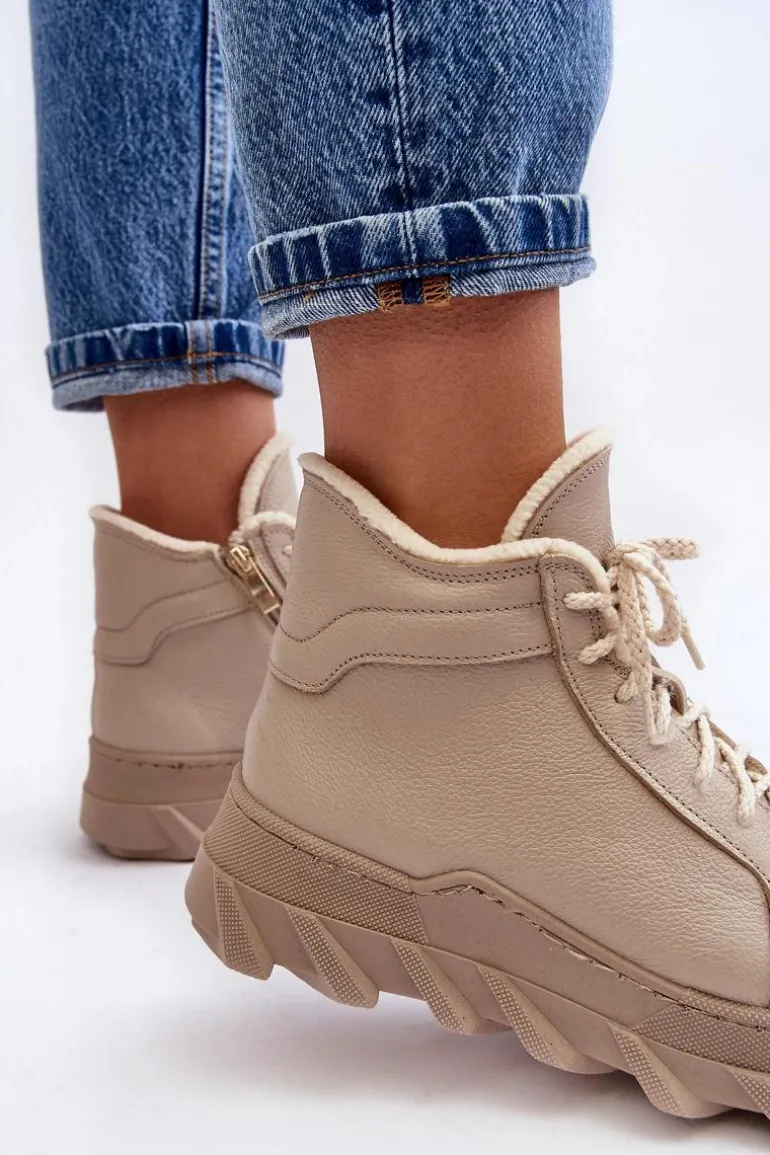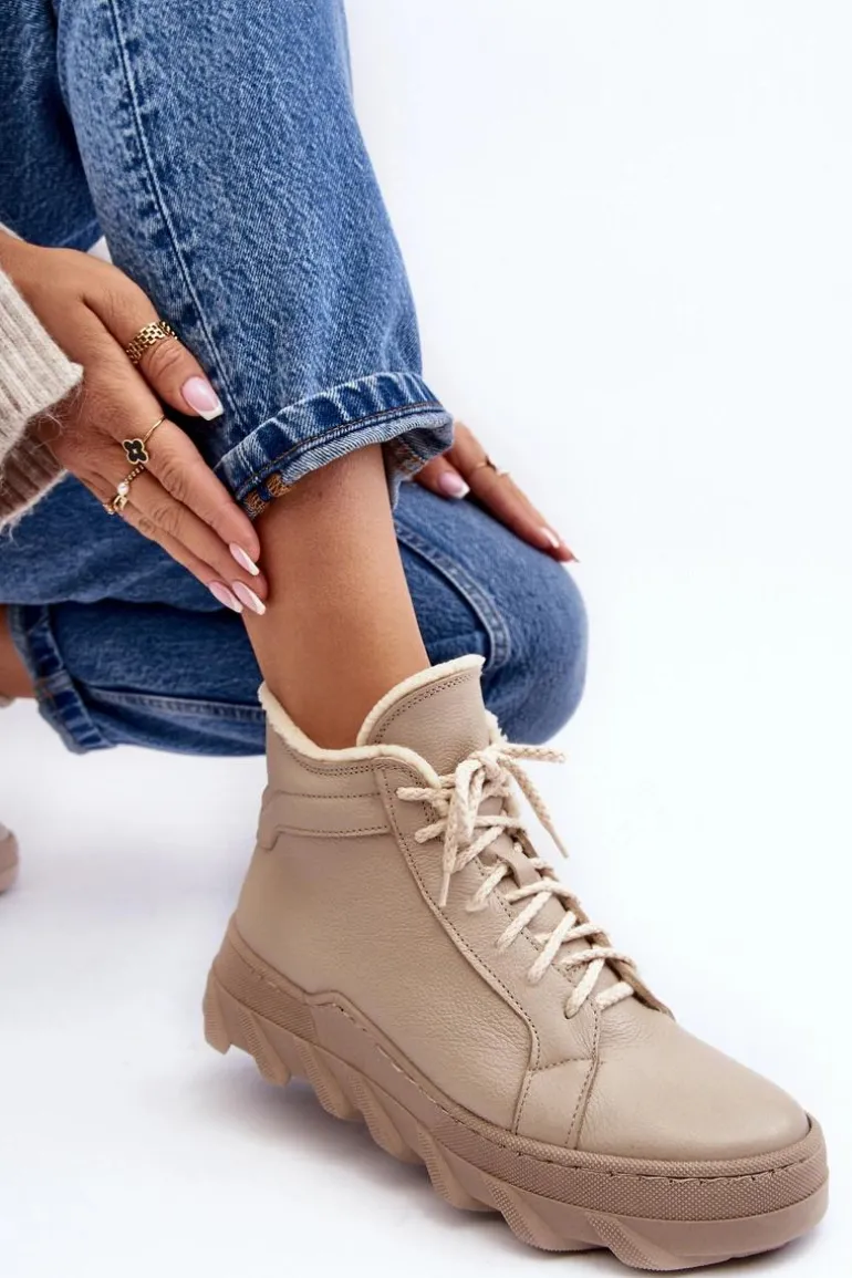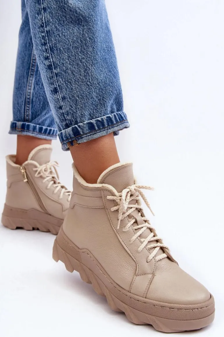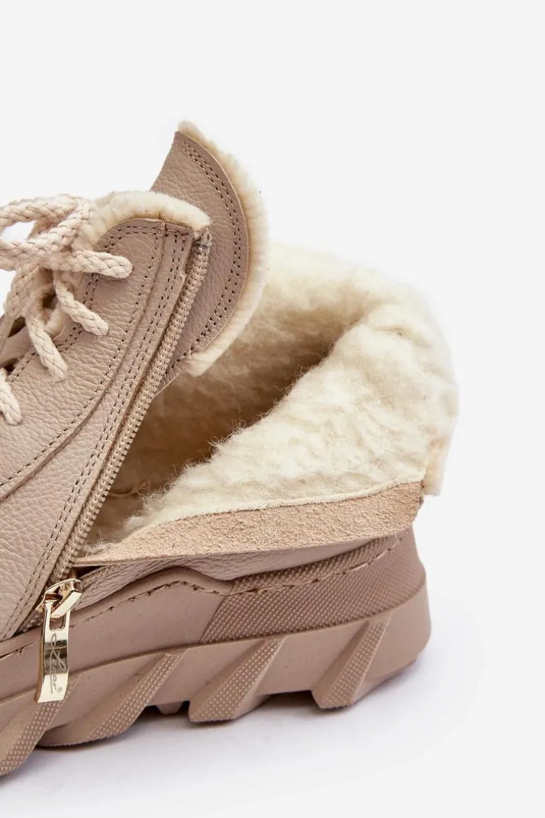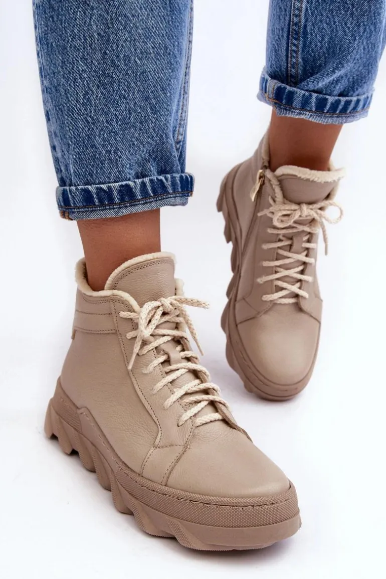 Botki damskie w sportowym stylu zostały wykonane ze skóry naturalnej. Osadzone na platformie z gumowego tworzywa. Wewnątrz ocieplone naturalną wełną. Zapinane na suwak z boku cholewki oraz dodatkowo posiadają sznurowanie. Cholewka za kostkę. Noski zaokrąglone. Usztywniony zapiętek. Przy wyborze rozmiaru prosimy sugerować się tabelą rozmiarów.
