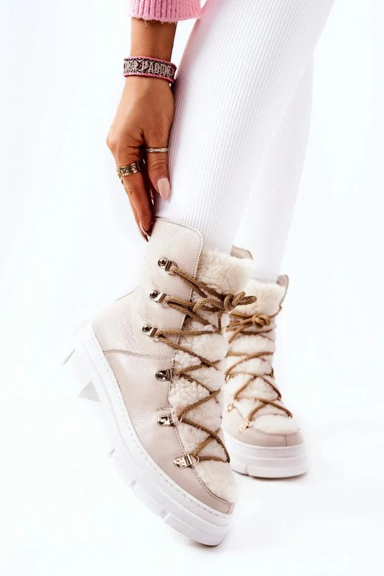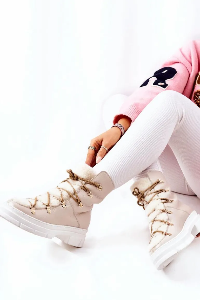 Ocieplane Skórzane Botki Trapery Jasnobeżowe Nerisso