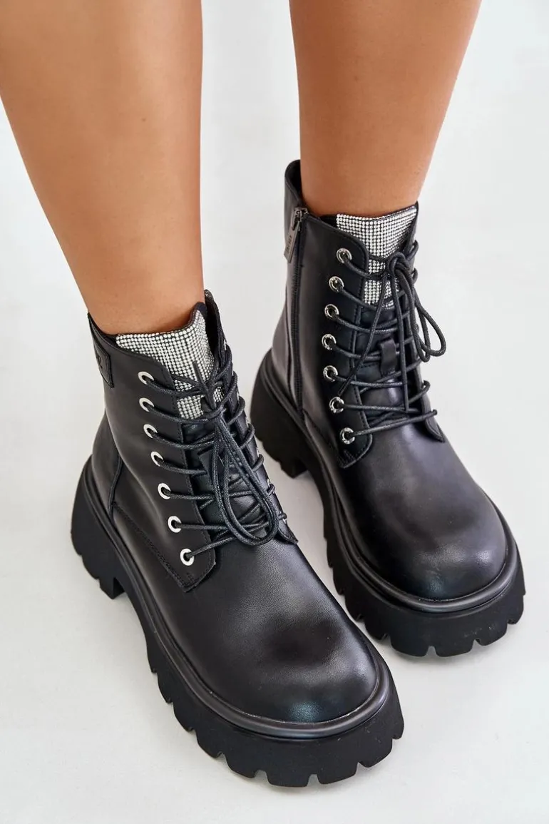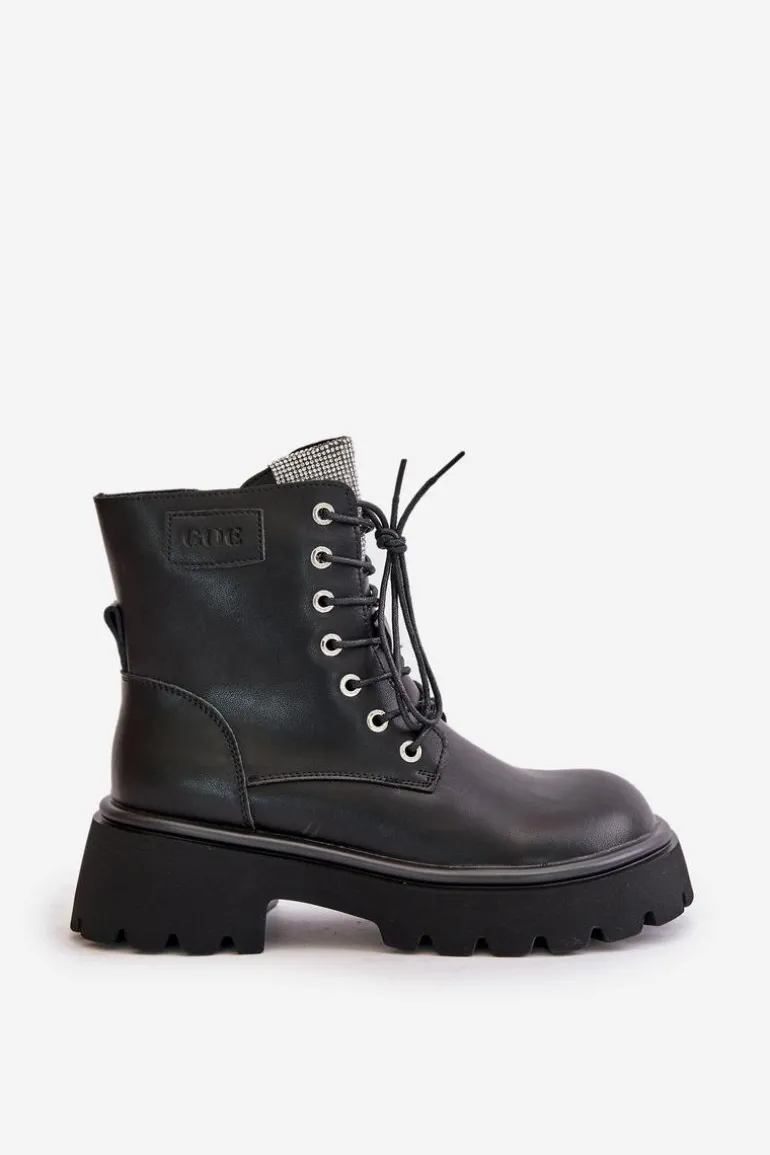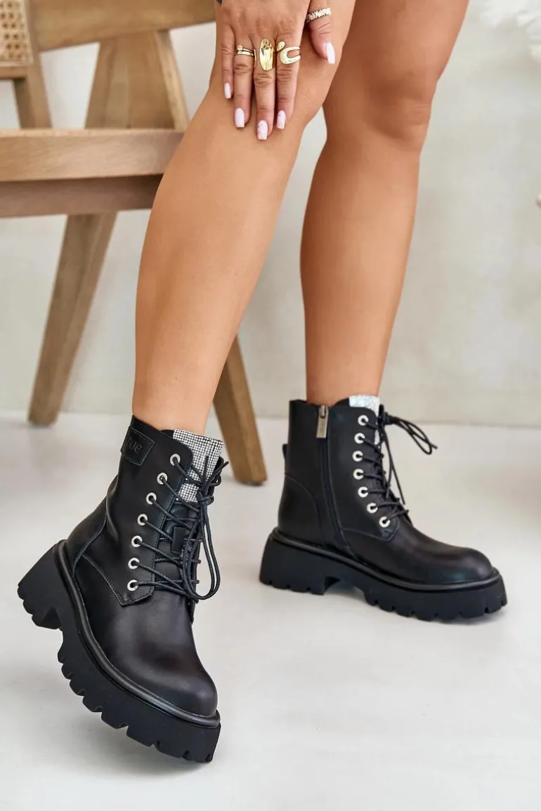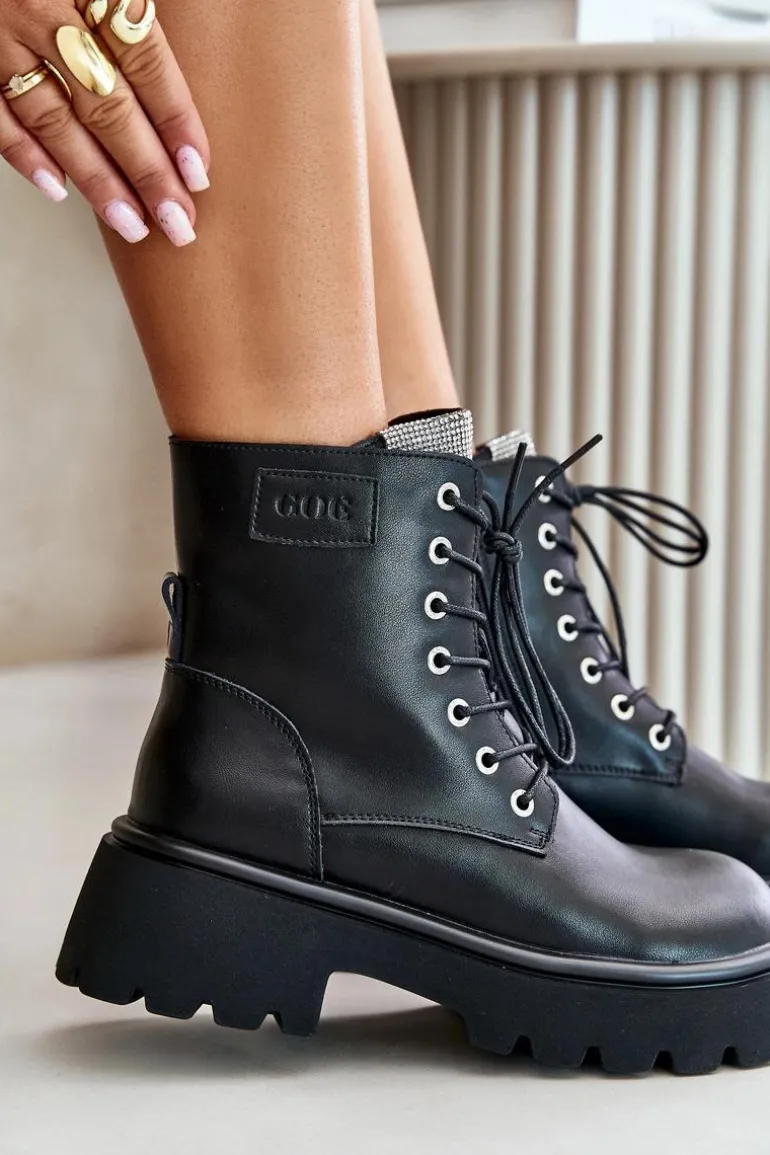 Damskie botki workery od marki Goe to stylowa propozycja dla miłośniczek modnych, a jednocześnie komfortowych rozwiązań. Wykonane z wysokiej jakości skóry naturalnej, łączą elegancję z trwałością. Osadzone na płaskim obcasie i solidnej platformie, zapewniają stabilność oraz wygodę podczas noszenia. Zaokrąglone noski dodają im subtelności, a ocieplony kocem obuwniczym środek gwarantuje ciepło w chłodne dni. Dodatkowym atutem są cyrkonie zdobiące język, które dodają wyjątkowego blasku i charakteru. Przy wyborze rozmiaru prosimy kierować się tabelą rozmiarów