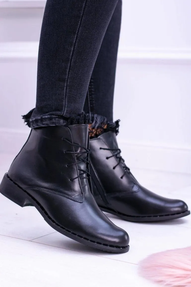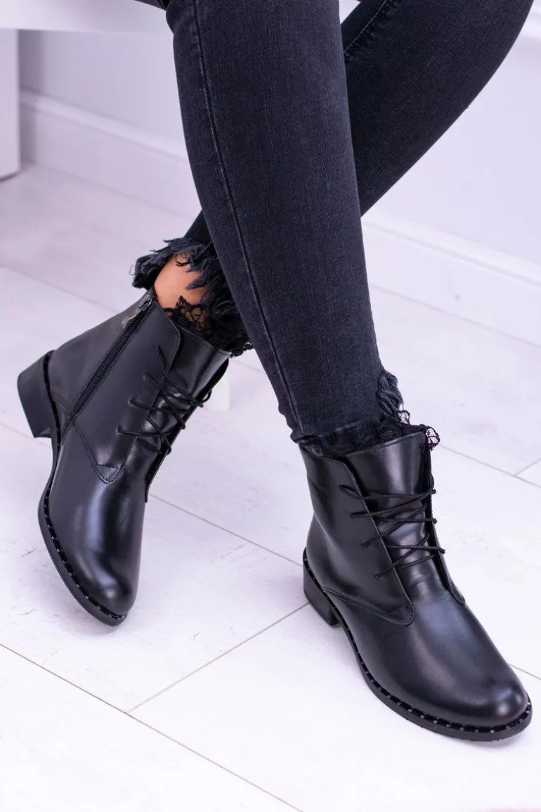 Ocieplane Skórzane Czarne Damskie Botki Z Koronką Millano