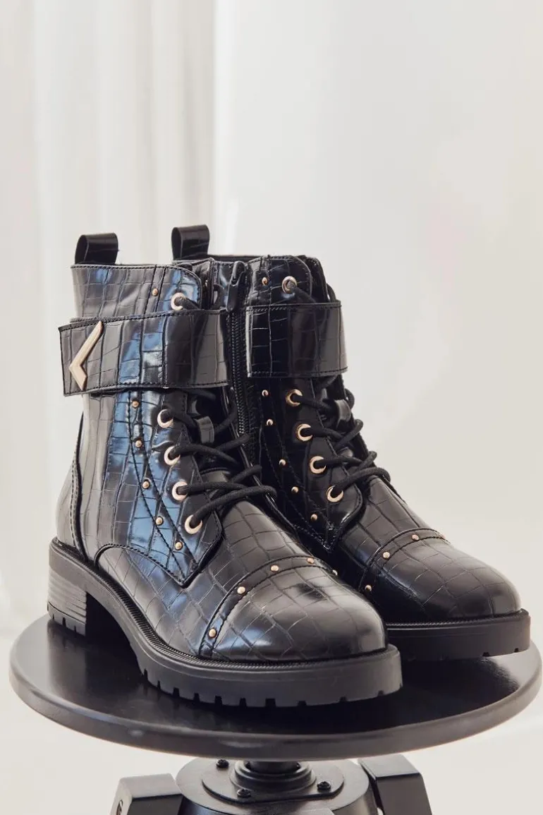 Wykonane ze skóry ekologicznej. Posiadają ocieplenie w postaci przyjemnego w dotyku koca obuwniczego. Klasyczny fason ze sznurowaniem oraz zapinaniem z boku cholewki. Botki posiadają także ozdobny pasek zapinany na rzep. Przy wiązaniu oraz na przodzie buta występują ozdobne elementy w postaci dżetów. Niski obcas sprawia, że botki są niezwykle stabilne. Przy wyborze rozmiaru prosimy sugerować się tabelą rozmiarów.