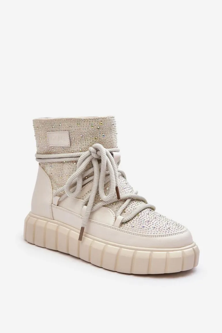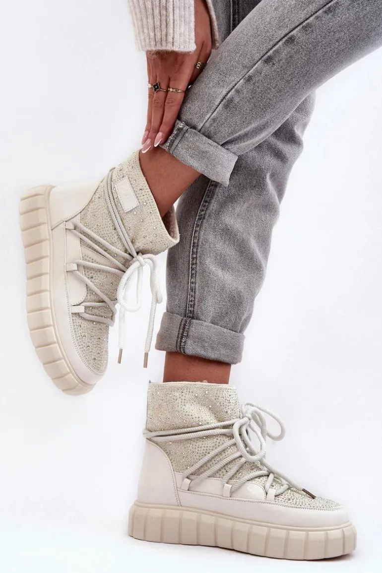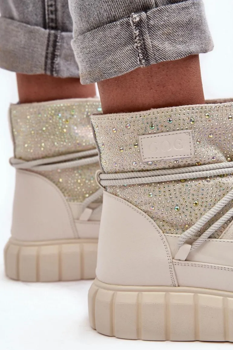 Śniegowce marki GOE zostały wykonane z połączenia skóry naturalnej i materiału tekstylnego. Środek ocieplony kożuchem. Model wsuwany z dodatkowym wiązaniem. Cholewka ozdobiona licznymi, błyszczącymi dżetami. Zapiętek jest usztywniony. Niezwykle ciepłe, a zarazem stylowe. Koniecznie powinnaś je mieć! Przy wyborze rozmiaru prosimy sugerować się tabelą rozmiarów.