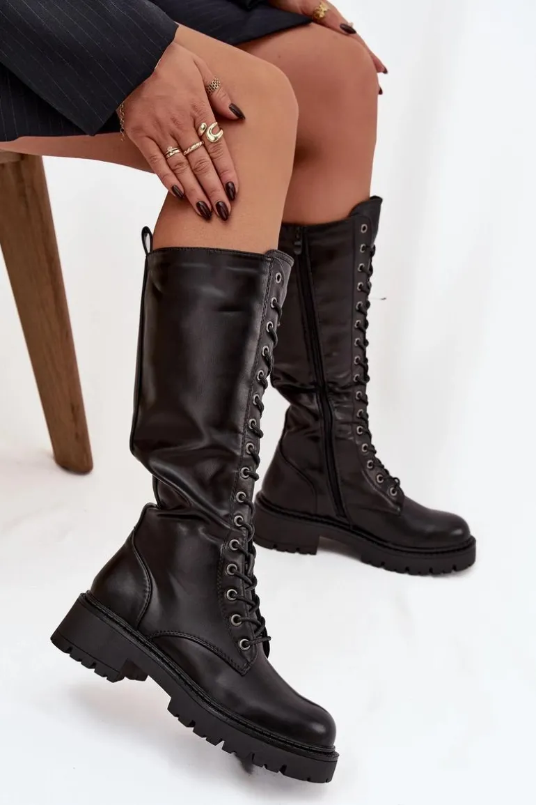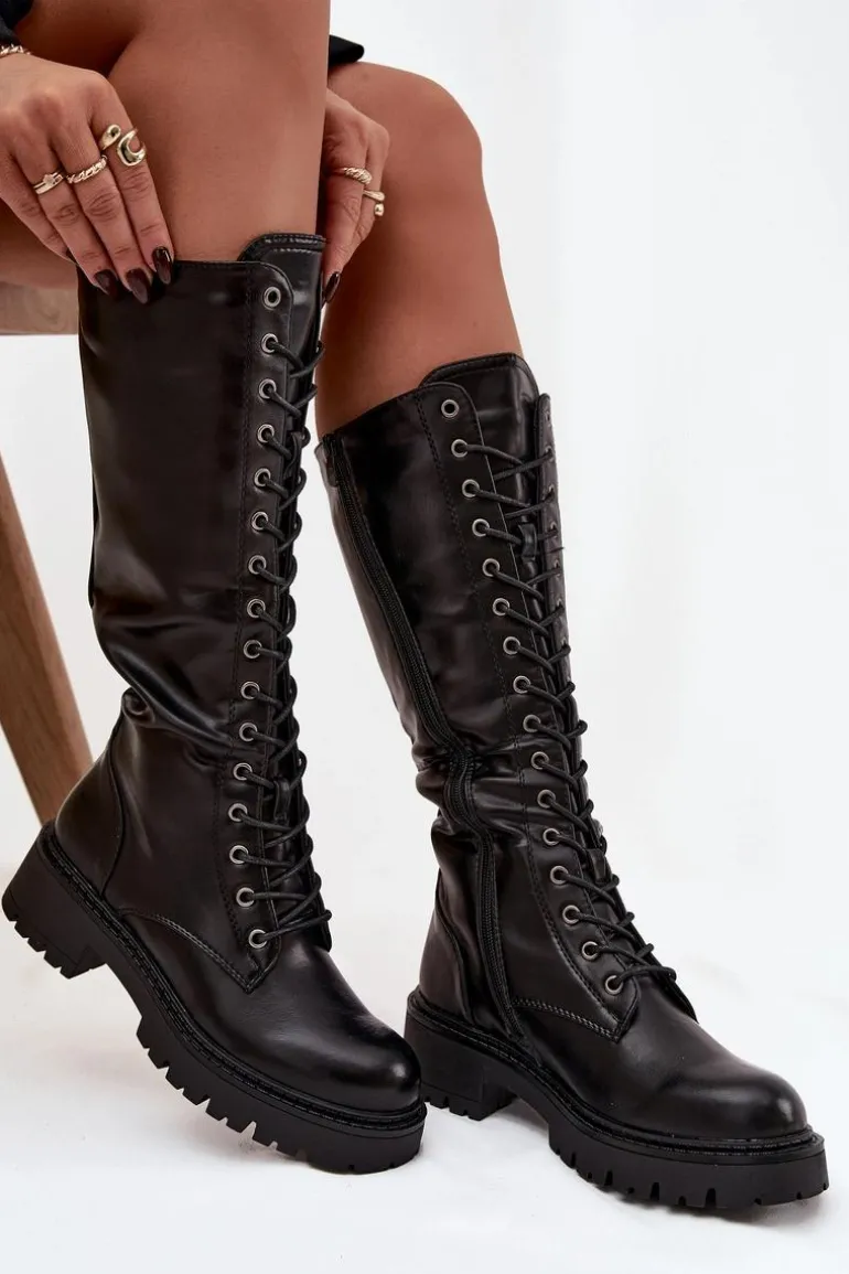 Kozaki glany damskie wykonane z eko skóry. Model wyróżnia się stylowym wyglądem, który świetnie wpisuje się w aktualne trendy. Buty są zapinane na zamek, co ułatwia ich zakładanie, a sznurowanie pozwala na idealne dopasowanie do nogi, zapewniając stabilność i wygodę podczas noszenia. Zaokrąglone noski nadają im klasycznego wyglądu, a ocieplane wnętrze wyłożone pianką pokrytą tkaniną gwarantuje komfort i ciepło w chłodniejsze dni. To uniwersalny model, który doskonale sprawdzi się w codziennych stylizacjach – zarówno z jeansami, jak i z sukienką w kontrastowym zestawieniu. Idealne dla kobiet, które lubią łączyć wygodę z wyrazistym stylem.