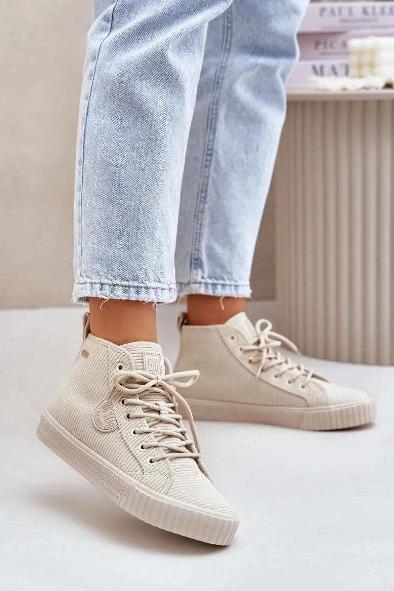 Trampki damskie z prążkowaną cholewką od marki Big Star. Wykonane z materiału tekstylnego. Osadzone na podeszwie z gumowego tworzywa. Noski zaokrąglone. Środek ocieplany futerkiem typu baranek. Dodatkowo model ten posiada wkładkę HI-POLY SYSTEM, która jest oddychająca, absorbuje wilgoć, amortyzuje wstrząsy oraz jest odporna na ścieranie i odkształcenia. Przy wyborze rozmiaru prosimy sugerować się poniższą tabelą rozmiarów.