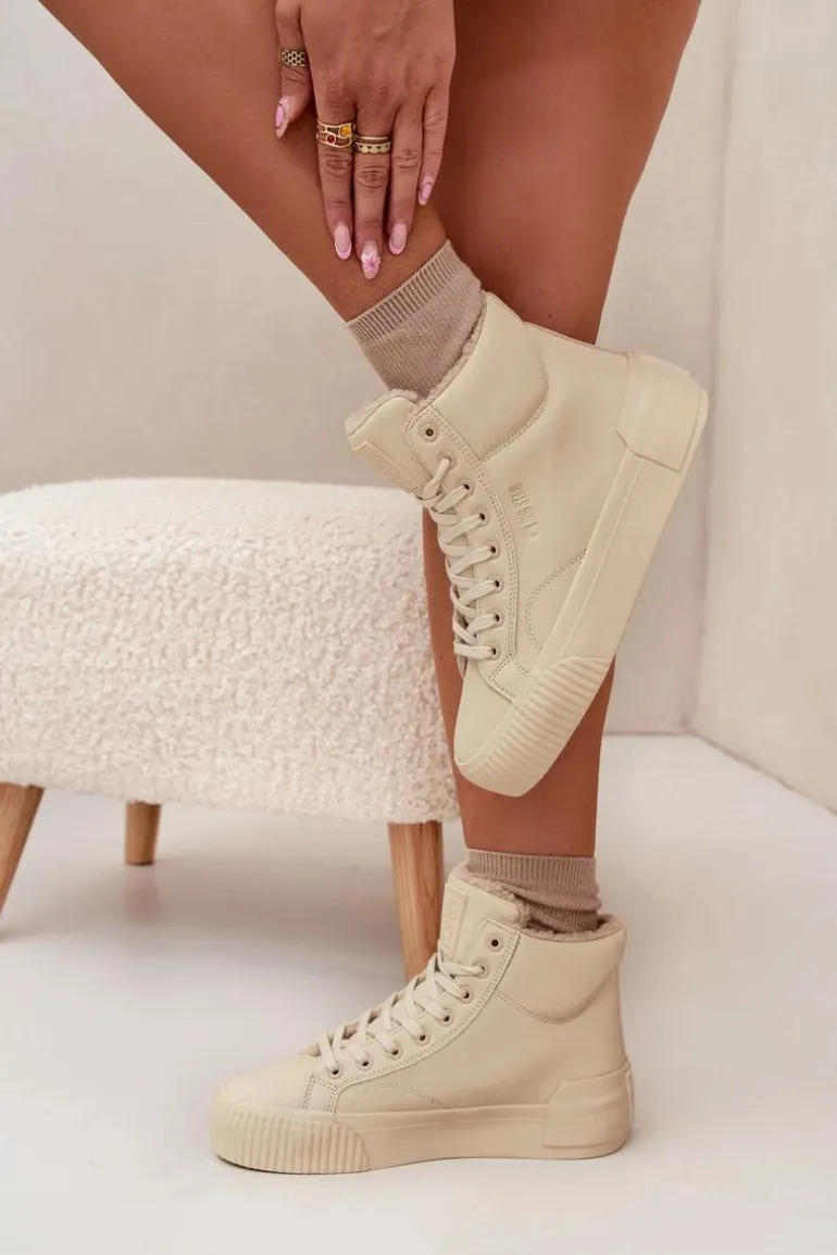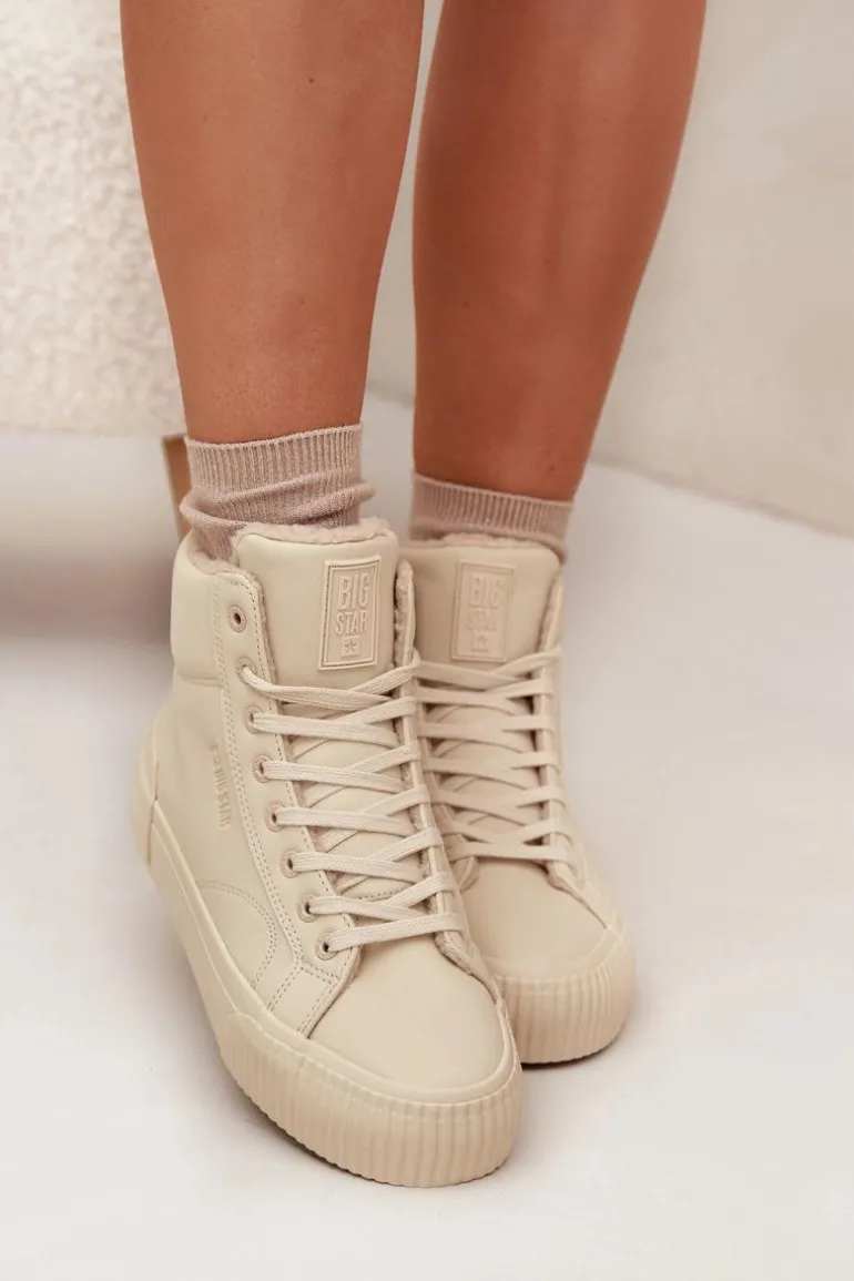 Trampki damskie od marki Big Star. Wykonane z eko skóry, osadzone na platformie z gumowego tworzywa, zapewniają wygodę i stabilność na każdym kroku. Model sznurowany pozwala na idealne dopasowanie do stopy, a ocieplenie kożuszkiem wewnątrz butów gwarantuje ciepło w chłodniejsze dni. Doskonałe na co dzień, te trampki łączą styl z funkcjonalnością, stanowiąc świetny wybór do jesiennych i zimowych stylizacji. Przy wyborze rozmiaru prosimy sugerować się tabelą rozmiarów.