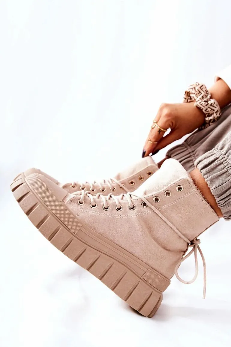 Wysokie trampki zostały wykonane z eko zamszu. Posiadają masywną platformę. Posiadają wiązanie, które można dopasować do tęgości nogi. Długie sznurówki sprawiają, że można je modnie owinąć wokół cholewki i zawiązać. Z boku są zapinane na suwak. Trampki w środku posiadają ocieplenie w postaci delikatnego futerka. Przy wyborze rozmiaru prosimy sugerować się tabelą rozmiarów.