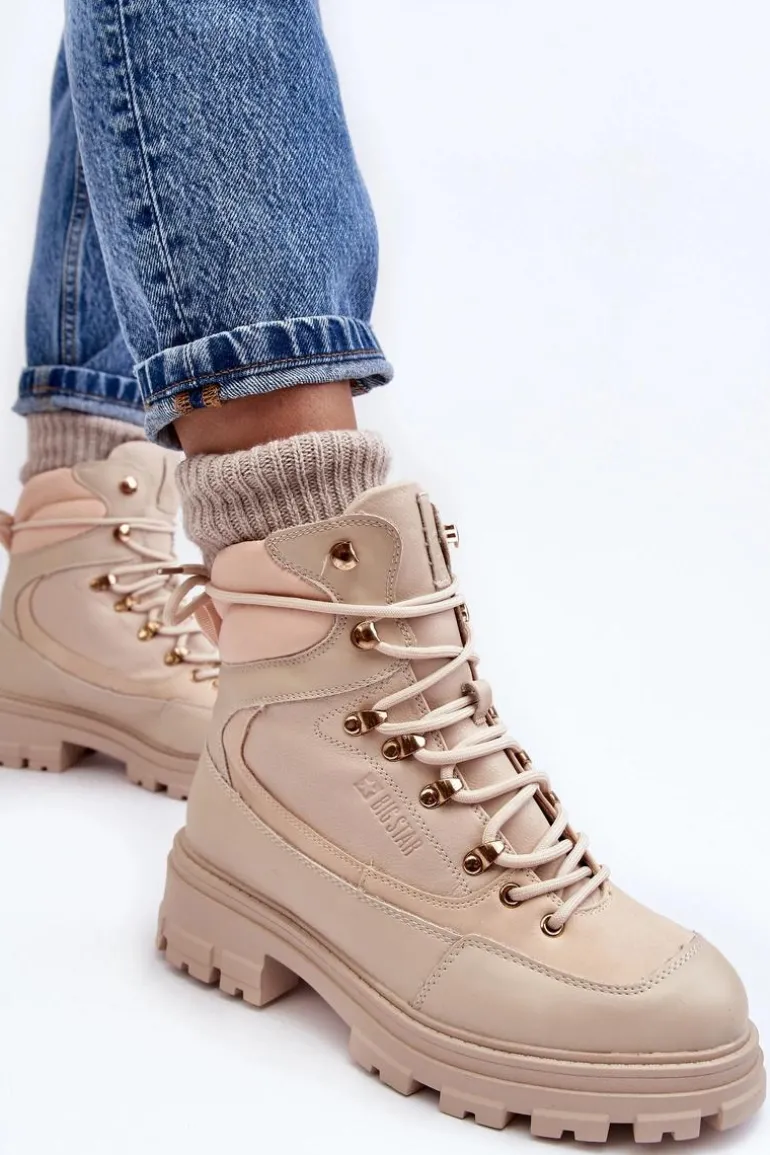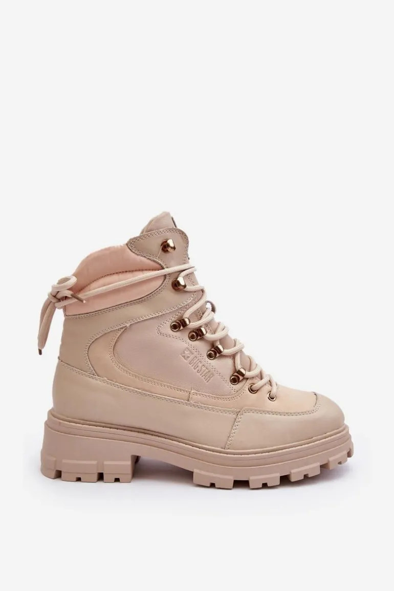 Damskie botki — trapery marki Big Star zostały wykonane z eko skóry. Osadzone na płaskim obcasie oraz platformie z gumowego tworzywa. Model klasycznie sznurowany. Środek ocieplony kocem obuwniczym. Zapiętek jest usztywniony. Noski zaokrąglone. Przy wyborze rozmiaru prosimy sugerować się tabelą rozmiarów.