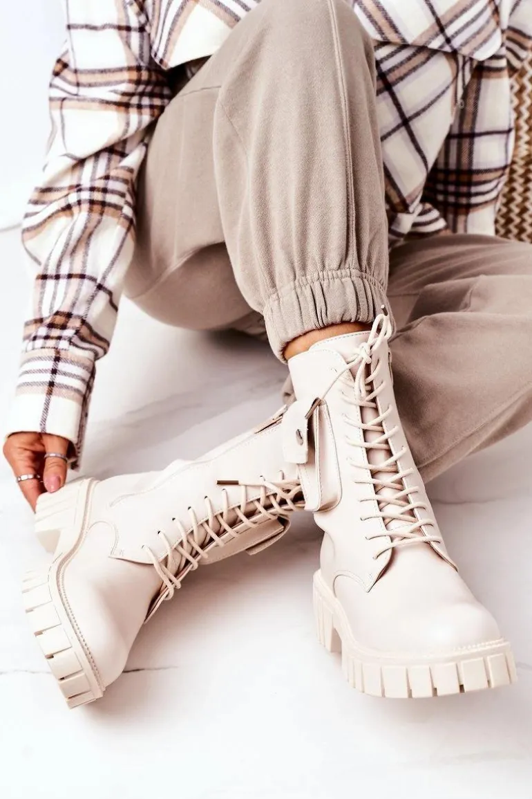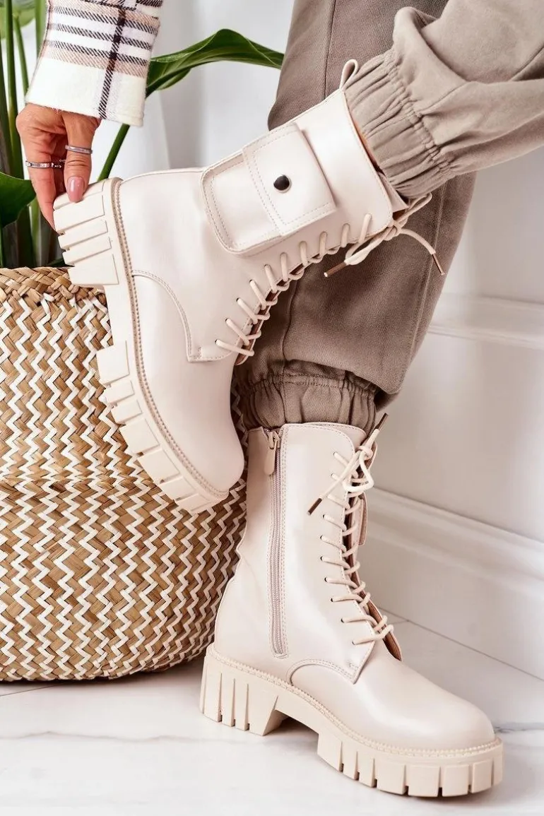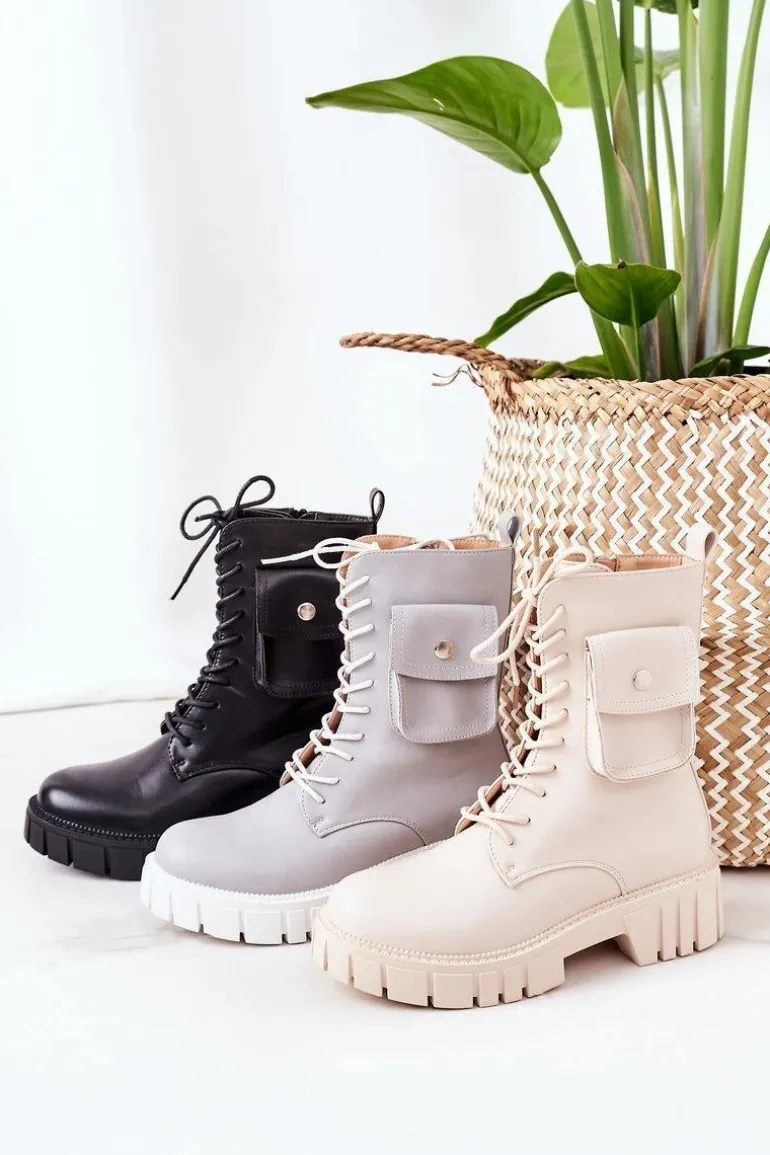 Botki damskie wykonane ze skóry ekologicznej ozdobione modną kieszonką. Wnętrze butów ocieplone jest miłym w dotyku kocem obuwniczym. Przy wyborze rozmiaru prosimy sugerować się tabelą rozmiarów.