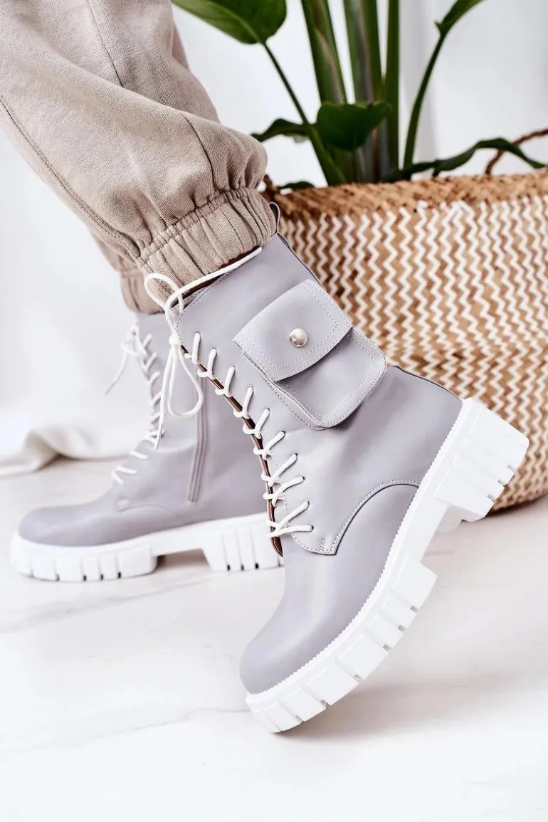Botki damskie wykonane ze skóry ekologicznej ozdobione modną kieszonką. Wnętrze butów ocieplone jest miłym w dotyku kocem obuwniczym. Przy wyborze rozmiaru prosimy sugerować się tabelą rozmiarów.