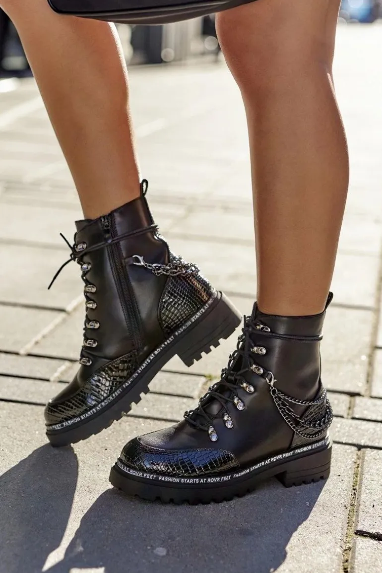 Wyjątkowe botki damskie wykonane z eko skóry. Workery są ocieplone miłym w dotyku kocem obuwniczym. Posiadają zapinanie na zamek oraz zdobienia w postaci łańcuchów. Przy wyborze rozmiaru prosimy sugerować się tabelą rozmiarów.