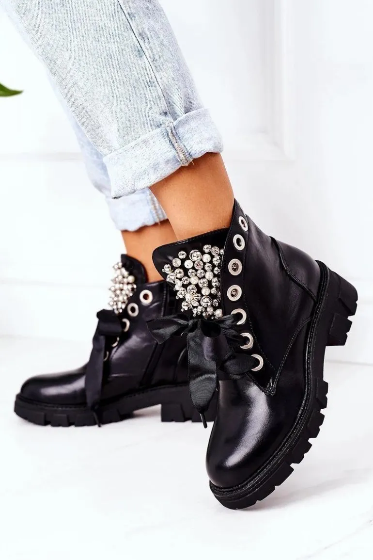 Wyjątkowe botki damskie wykonane z eko skóry. Wnętrze ocieplone jest miłym w dotyku kocem obuwniczym. Model wyróżnia się krojem cholewki oraz ozdobami. Przy wyborze rozmiaru prosimy sugerować się tabelą rozmiarów.
