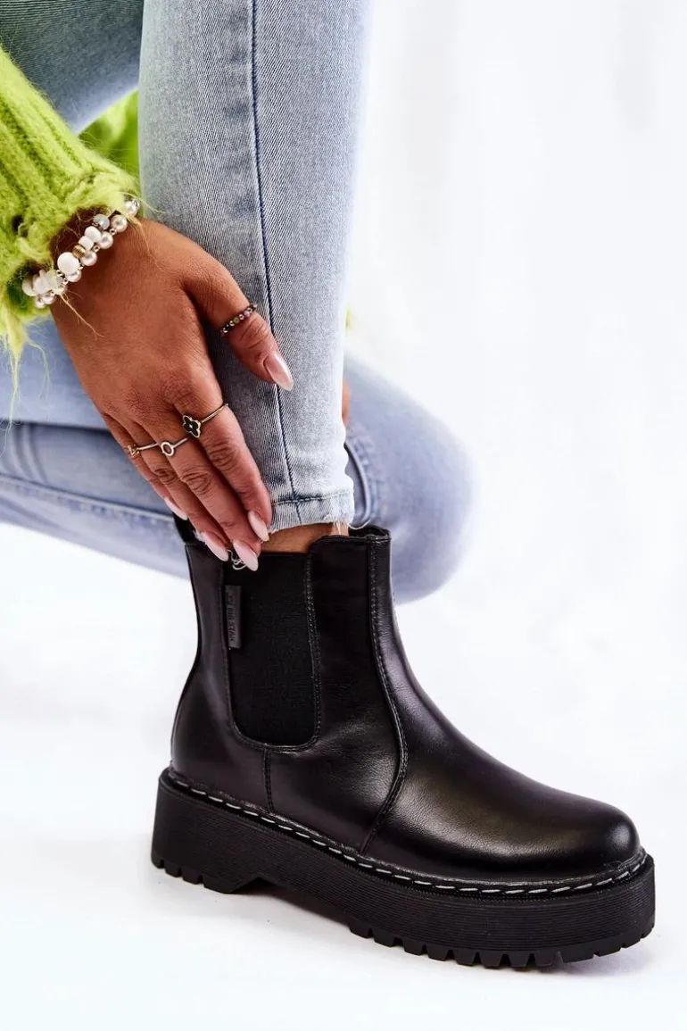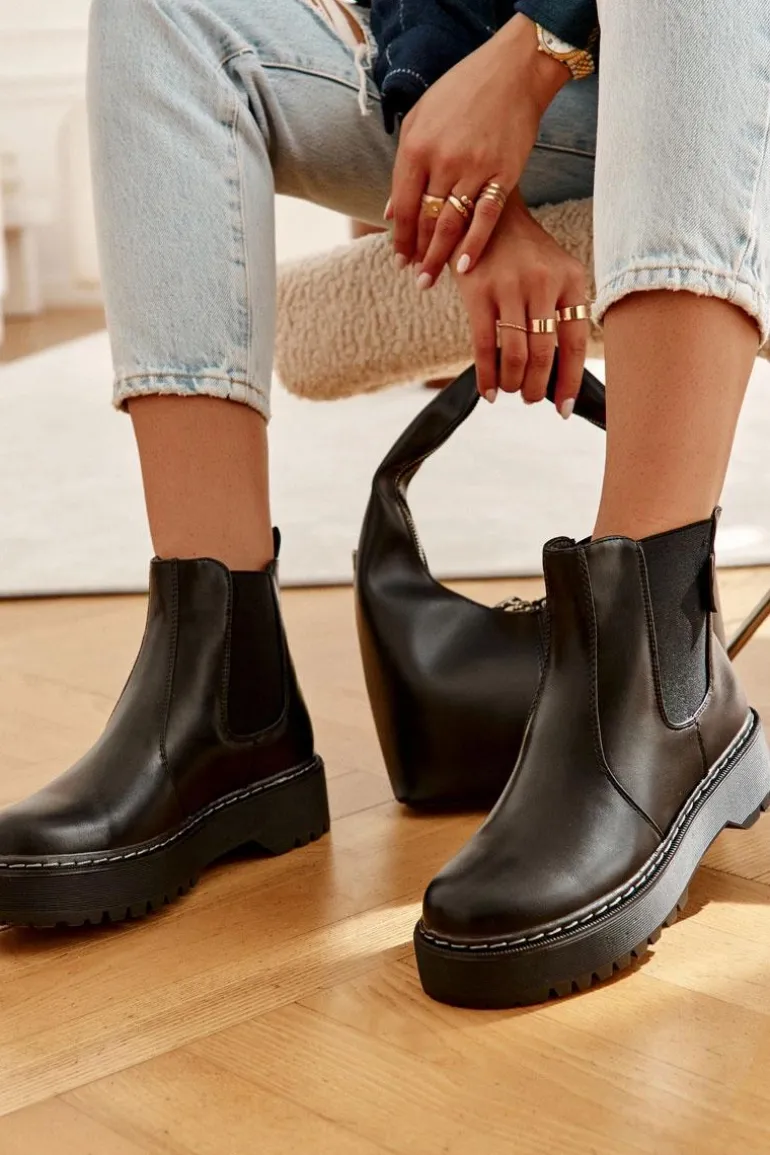 Modne botki wsuwane marki Big Star na pewno skradną Twoje serce! Model został wykonany z eko skóry. Ocieplone miłym w dotyku kocem obuwniczym. Osadzone na płaskim obcasie i platformie z bieżnikiem. Nosek zaokrąglony. Elastyczna cholewka pozwoli na odpowiednie dopasowanie obuwia. Świetnie będą komponować się z woskowanymi spodniami. Przy wyborze rozmiaru prosimy sugerować się tabelą rozmiarów.