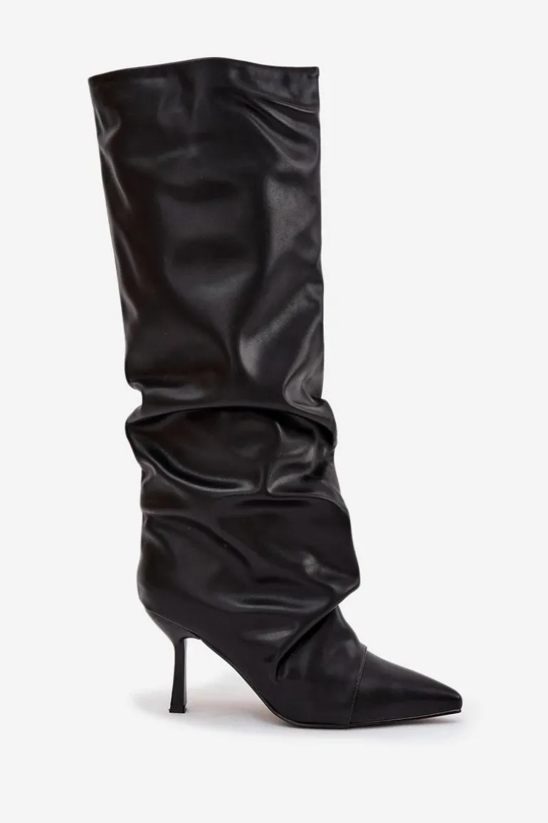Kozaki damskie wykonane z wysokiej jakości eko skóry to model stworzony dla kobiet ceniących elegancję i modny wygląd. Osadzone na smukłej szpilce pięknie wysmuklają sylwetkę i dodają stylizacji kobiecego charakteru. Ich wsuwany fason uzupełniony marszczeniem na cholewce nadaje całości efektownego, nowoczesnego wyglądu i sprawia, że buty stają się wyrazistym akcentem outfitu. Wnętrze ocieplane kocem obuwniczym gwarantuje komfort i przyjemne ciepło podczas chłodniejszych dni. To kozaki, które świetnie sprawdzą się zarówno w eleganckich zestawach z sukienką czy spódnicą, jak i w bardziej codziennych stylizacjach, dodając im nuty szyku i klasy. Idealny wybór na jesień i zimę. Przy wyborze rozmiaru prosimy kierować tabelą rozmiarów.